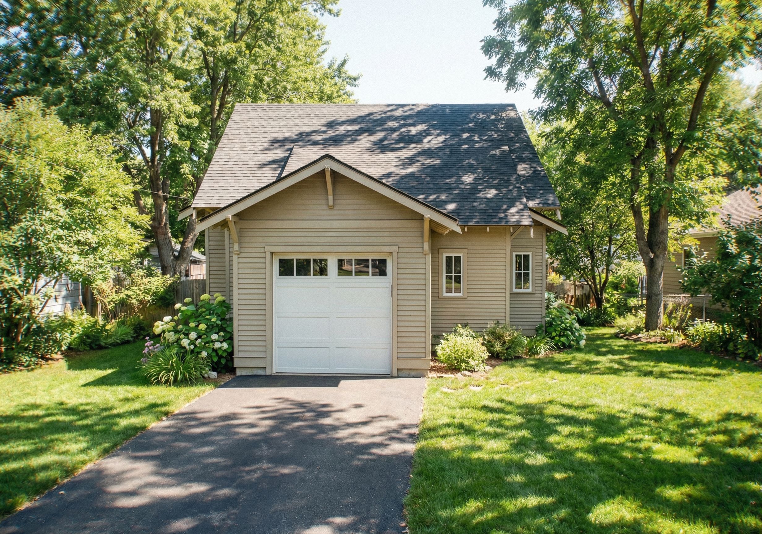 PromptCreate the back of this same house using the black and white reference image as the template for the perspective, roofline, window styles and locations. Keep to the same colors, materials, and styles in the color image., keep exact camera angle