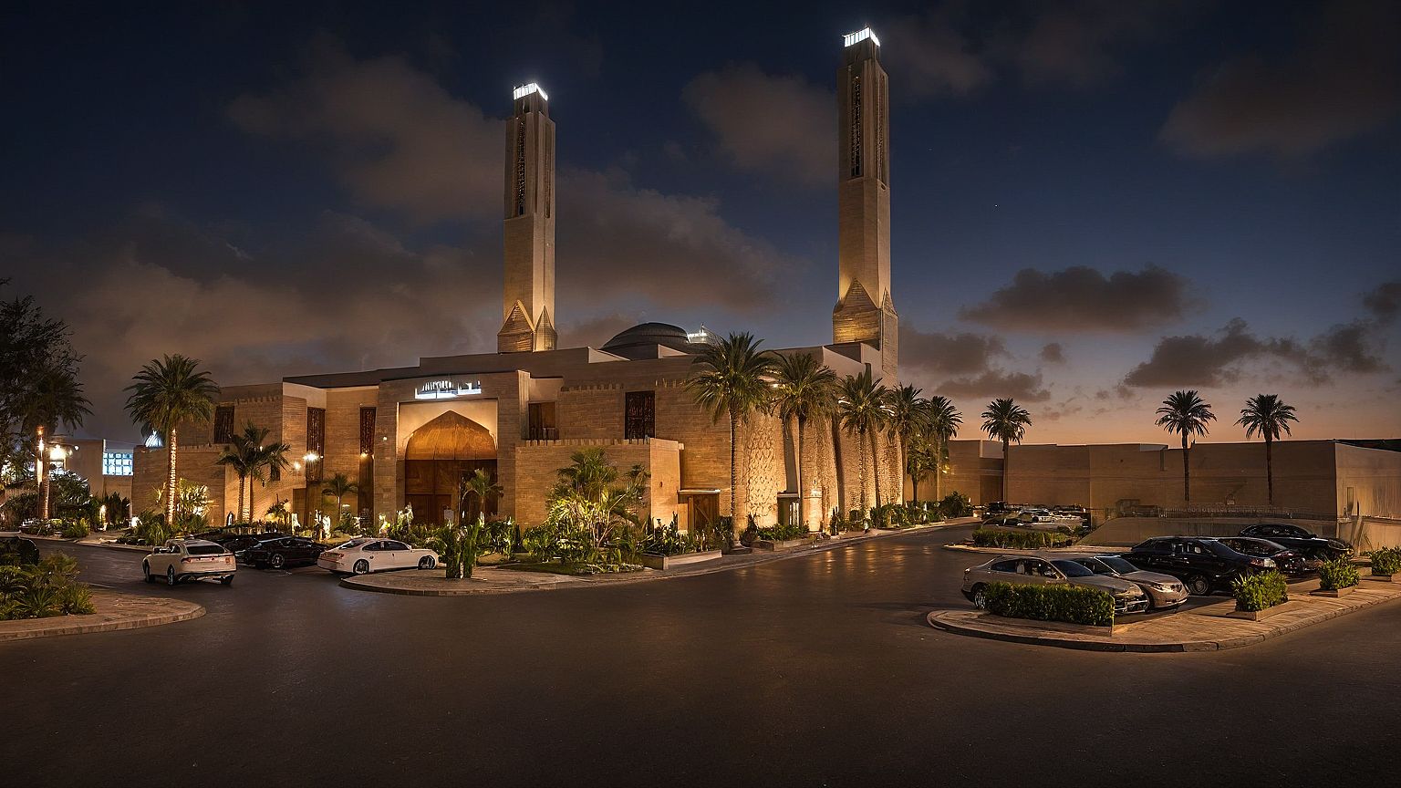 Photo of a sulaimani architecture Islamic Mosque with two Minarets, showcasing intricate stone facade elements and contrasting dark accents. Surrounded by lush palm trees and landscaped gardens, the structure is set in an urban area with nearby vehicles and pedestrians. night scene with glamorous lights. Captured from a low angle to emphasize the height and architectural details, using a wide-angle lens for an expansive view of the setting. Illuminate top of the two Minarets, and illuminate all windows