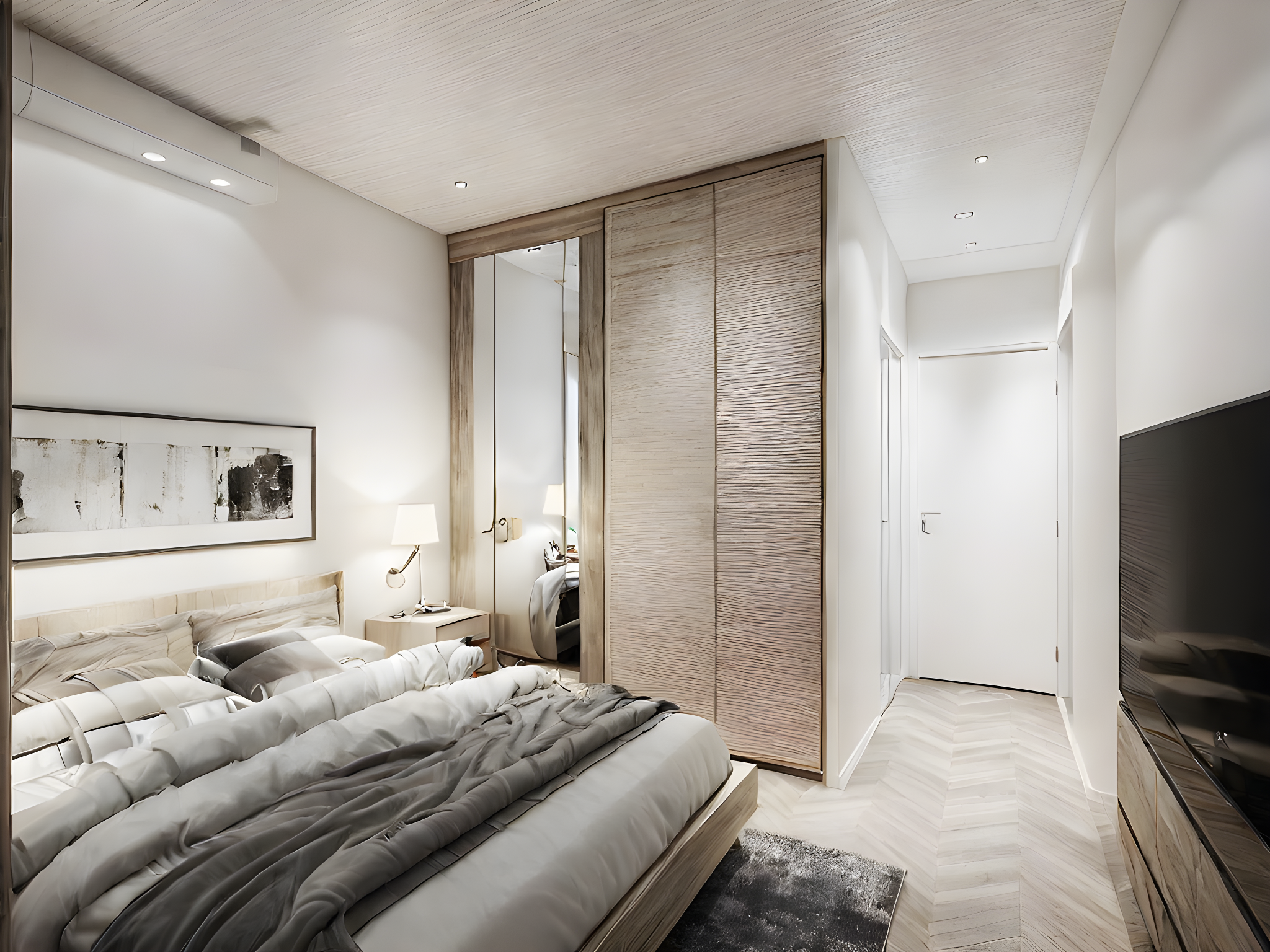 detailed photo of a modern bedroom with tv, white ceiling and mirror wardrobe. no window. white walls. and painting.