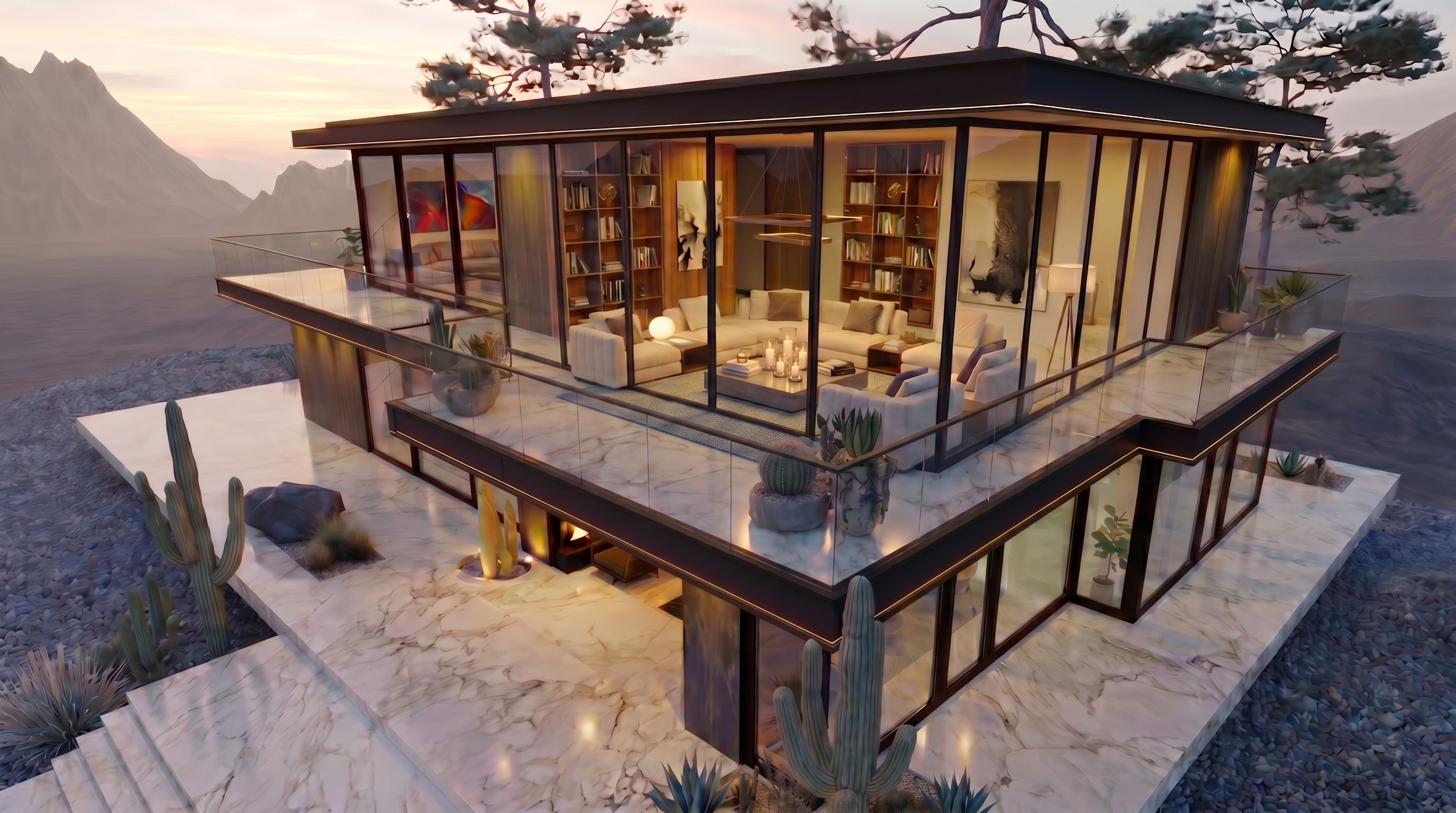PromptMantén el mismo diseño tanto del paisaje y de la arquitectura de interiores, su decoración y sus materiales y acabados. Elimina el sillón gris que está por fuera del cerramiento. Elimina la alfombra de la planta superior. Añade una alfombra en el interior del cerramiento que bordee los sillones en la planta superior. , keep exact camera angle