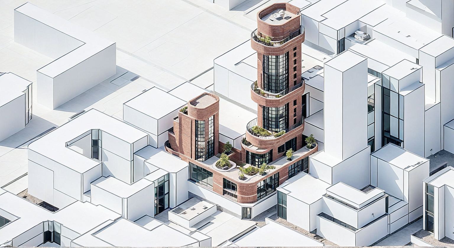 Promptbrick and aluminum condo building with wrap around balconies. All white background with no detail.