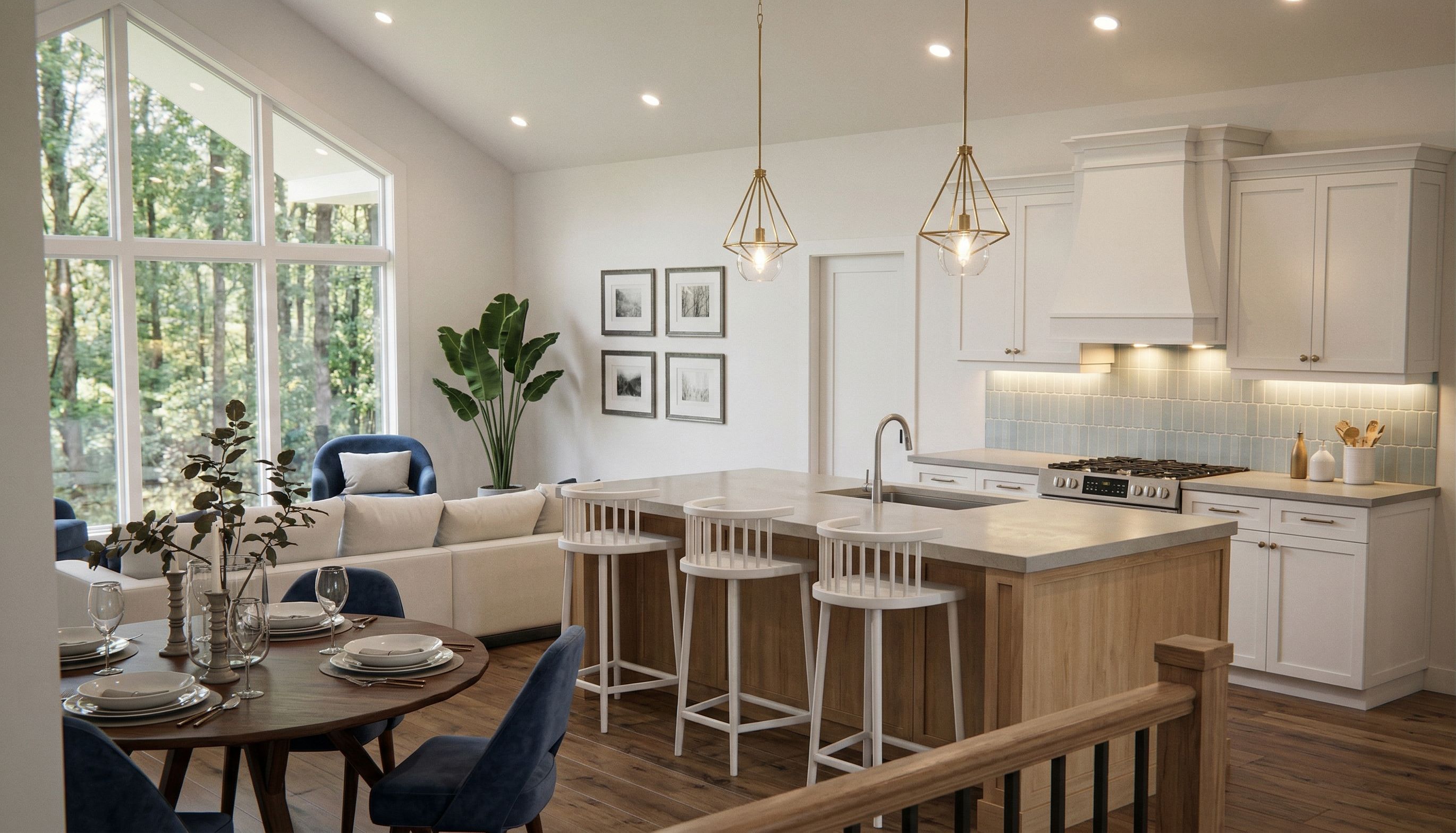 Create another view of the reference photo show, but in the uploaded image angle. show the same elements and decor. add a beautiful wooded view from the windows, smooth ceiling with pot lights, and matching hanging lights seen in reference photo, show a closed white pocket door near the kitchen, turn on under cabinet and range hood lights, match the range hood to the cabinets, keep exact camera angle