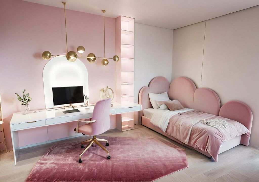 Promptwhite and pastel pink furniture, cosy velvety pastel pink bed with velvety headrests, one rug on the floor, put some stuff on the regal