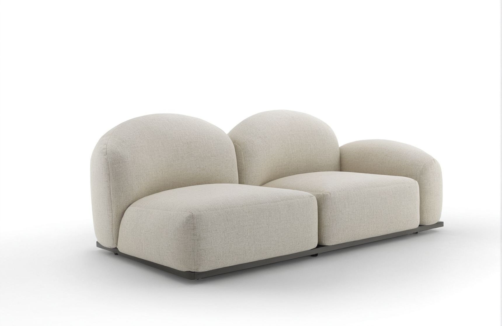 Create an image of a modern sofa featuring soft and visually comfortable cushions with smooth, puffy texture. Each cushion has fine stitching along the edges, emphasizing the padding. The sofa's frame is made of sleek metal tubing that contrasts in color with the cushions, giving the piece a contemporary and stylish look