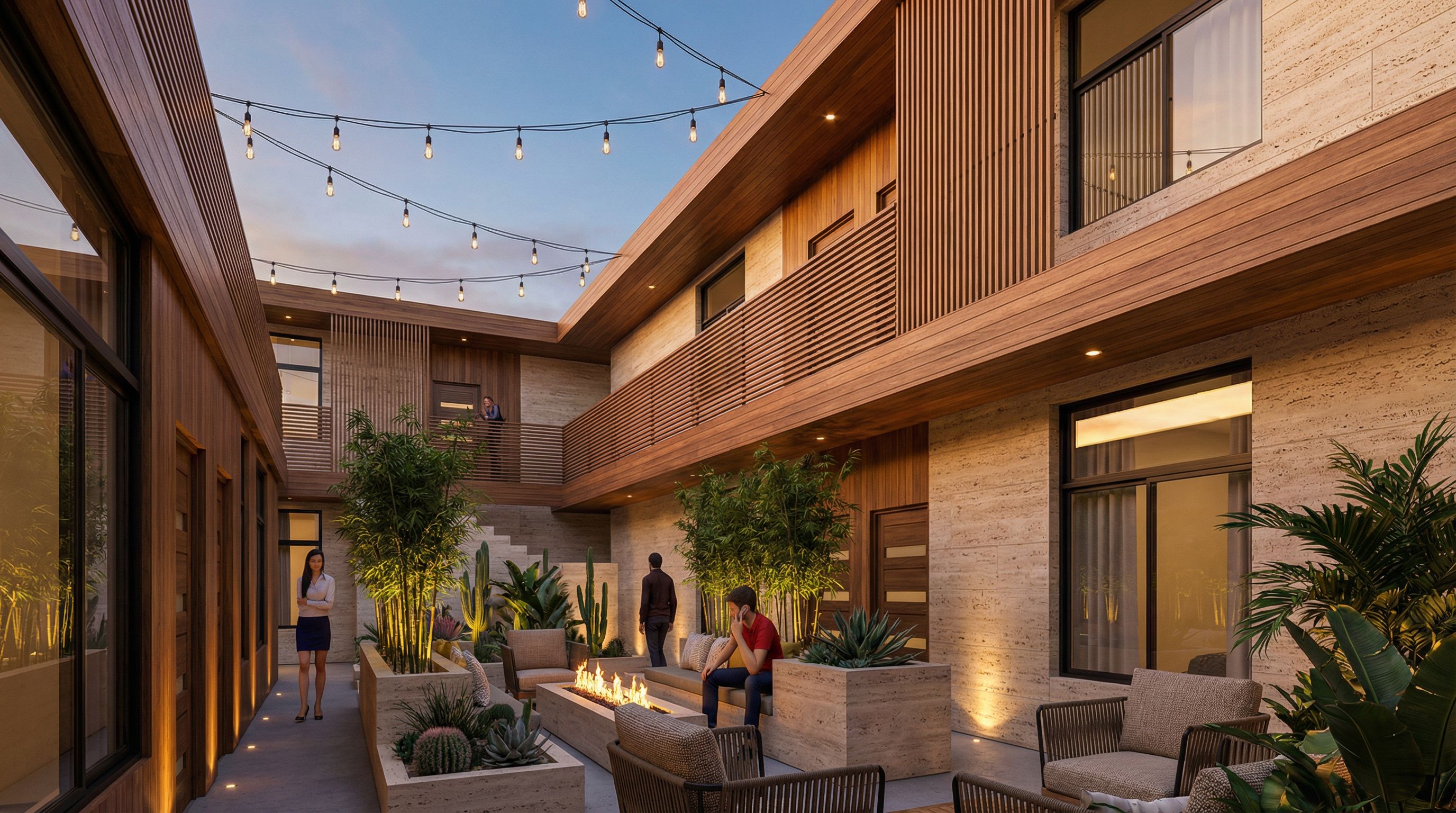architectural exterior rendering, render this 3D mass into photorealistic rendering, architectural exterior rendering, render this 3D mass into photorealistic rendering, Photo of modern desert boutique hotel style building featuring sleek wooden facades with travertine accents and tall linear screen wall details and expansive glass windows, surrounded by native vegetation in the courtyard which has meditation zones, grass areas, and fire pit conversation spaces with modern lounge furniture reflecting a harmonious blend of architecture and nature. Add black wire with individual light bulbs run from one side of the top of the building to the other side. Golden hour lighting casts warm hues, highlighting textures of the wood and landscape. Captured from a low angle, the perspective emphasizes the juxtaposition between the structures and the natural surroundings, with a wide lens for a spacious feel. Add an organic desert modern tropical landscaping with outdoor seating areas in front of the building and keep exact camera angle, high quality, professional, detailed scene. with low uplighting in courtyard to create an earthy peaceful mood., wide establishing shot, dusk atmosphere with soft lighting, high quality, professional, detailed scene