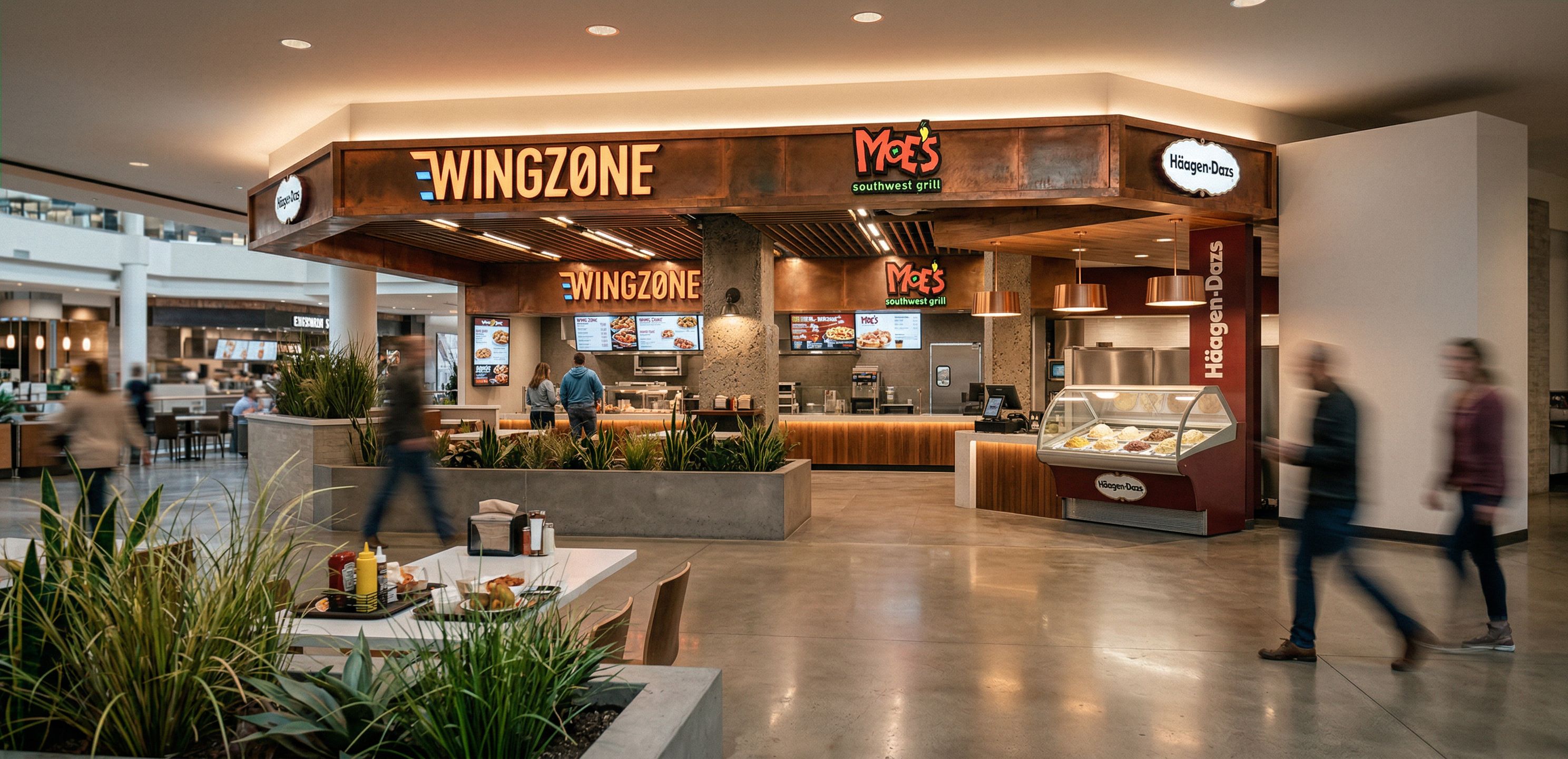 PromptFood Court. Use reference image to match style. copper drum pendants over ice cream., keep exact camera angle