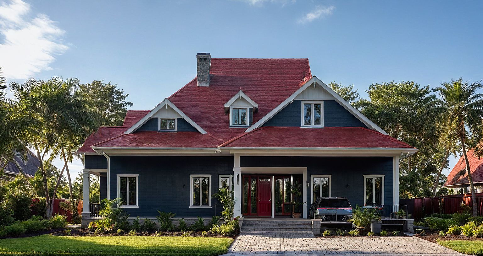PromptPhoto of a suburban single-family home with a distinctive gabled roof and an inviting front porch. Emphasize the contrasting materials, featuring dark exterior walls and vibrant red shingles. Surrounding gardens with lush greenery enhance the setting, complemented by palm trees. The scene is illuminated by soft sunlight, casting gentle shadows that highlight the architectural details. Capture this from a slightly low angle, showcasing the roofline against a bright blue sky, with a wide lens to include nearby vehicles parked in the driveway.