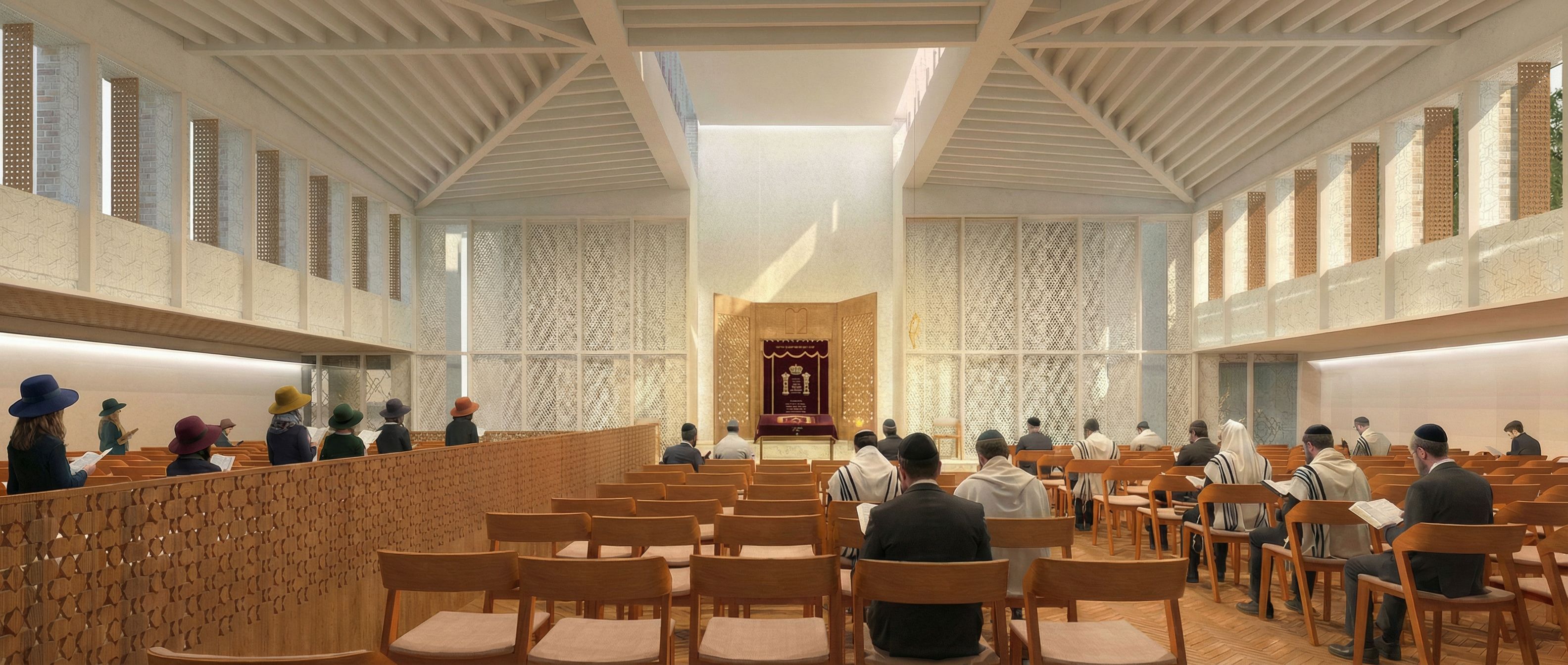 interior design rendering, render this 3D mass into photorealistic rendering, Keep everything as is except change the colour of the hats of the women to a range of colours, keep exact camera angle, including people, high quality, professional, detailed scene
