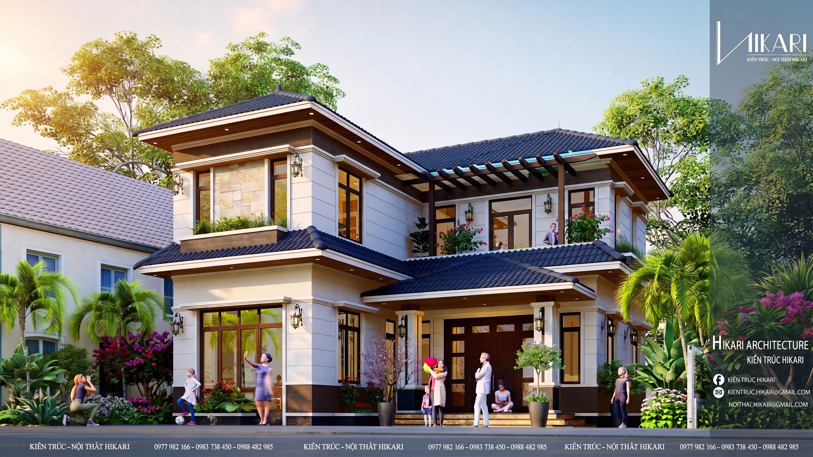 PromptThis photograph captures a modern house, notable for its elegant architectural details such as a triangular roof with dark grey-blue tiles, large windows with sophisticated frames, and a striking combination of white plaster accents complemented by white effect paint. A section of the wall between two small windows is clad in natural stone, the base of the house is covered in dark brown tile, and gray veined stone accents are used at the entrance steps. Situated in a vibrant urban garden filled with palm trees and colorful flowers, the house is surrounded by a peaceful neighborhood. The soft afternoon sunlight creates gentle shadows, highlighting the architectural details and contrasting colors. The overall angle and design of the house are preserved. The photograph is taken from a low angle to emphasize height and grandeur, using a wide-angle lens to convey spaciousness and a warm color palette that creates a welcoming atmosphere., keep exact camera angle