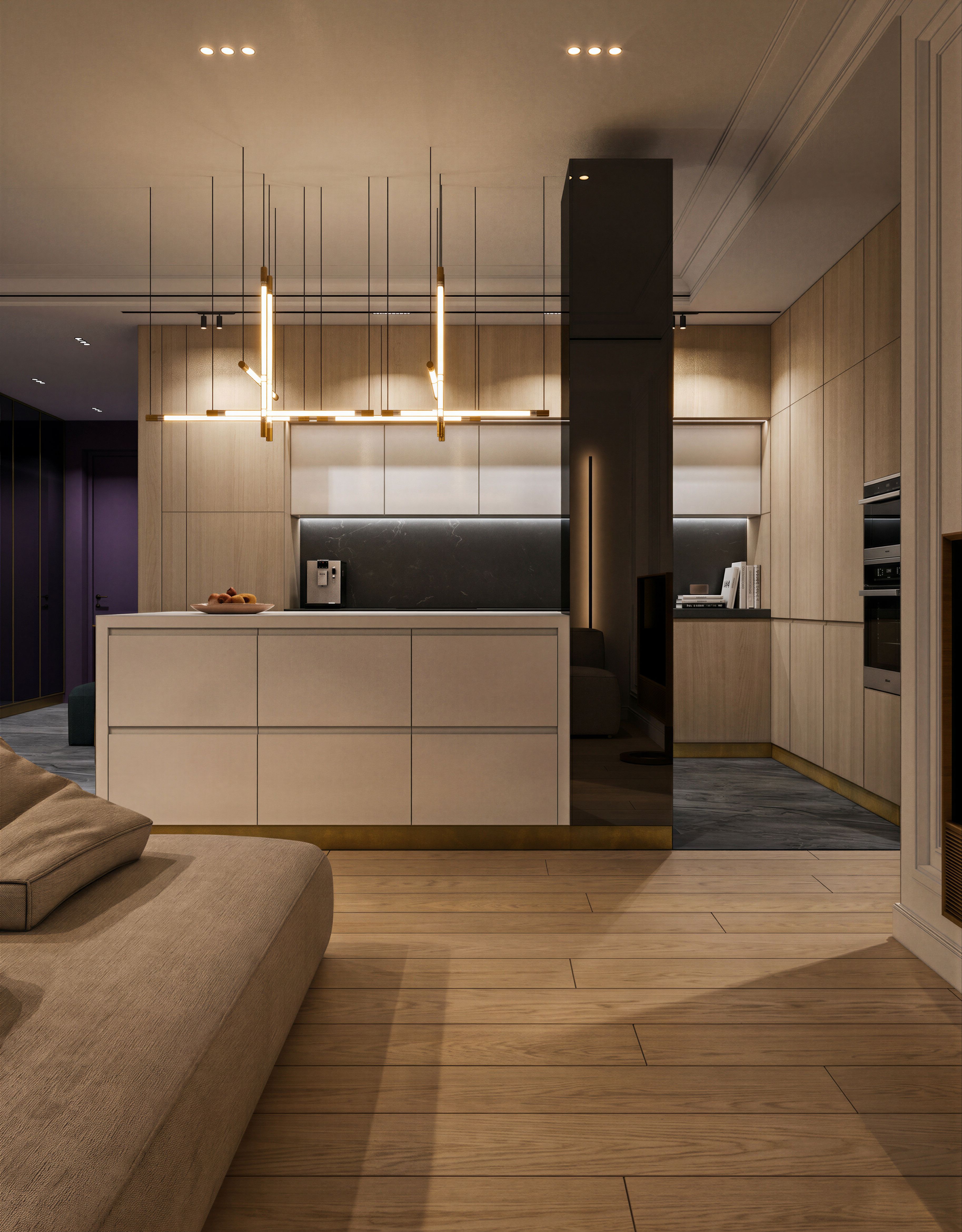Photo of a modern interior kitchen in an apartment, featuring sleek cabinetry and an open layout. Emphasize the contrast between the light wood accents and dark stone surfaces, highlighting textures and clean lines. The room is well-lit with recessed ceiling lights and a minimalist pendant fixture. Capture a wide angle that showcases the spatial arrangement, including the soft beige sofa in the foreground. Illuminate the room to create dynamic shadows on the floor, enhancing the warm atmosphere of the space., keep exact camera angle