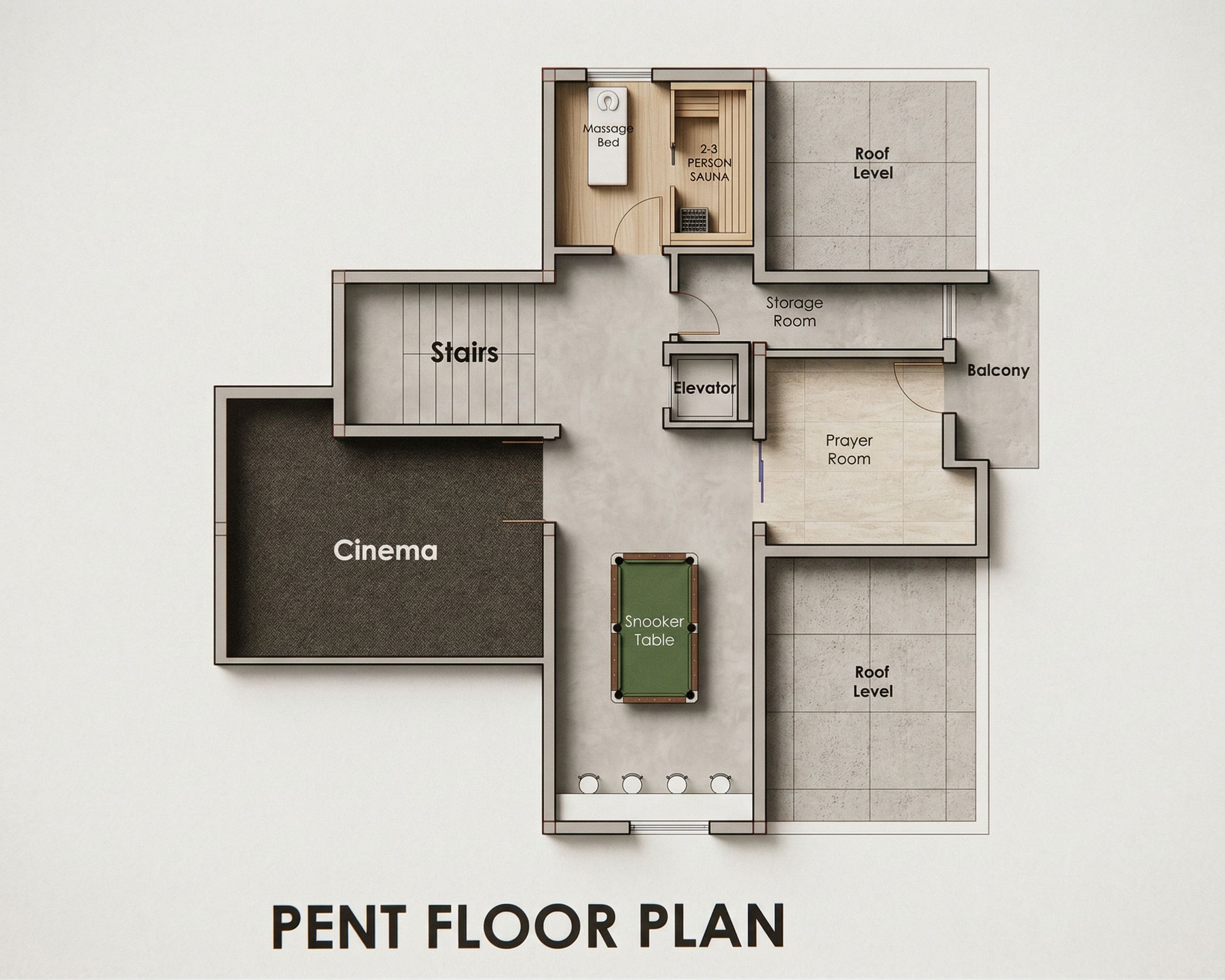 PromptCreate a high-quality 2D architectural floor plan render in top-down orthographic view, keeping the exact layout, proportions, and wall positions as shown. Include clearly labeled spaces: Cinema room Snooker area with table Staircase Elevator Prayer room Storage room Massage room with massage bed 2–3 person sauna Balcony Roof level / open terrace areas 🛋️ Style Instructions Clean, sharp architectural linework with proper wall thickness Light neutral color palette (white, beige, grey, light wood) Microcement / tile flooring for circulation areas Wood finish in selected rooms (massage, sauna) Minimal top-view furniture (snooker table, massage bed) Soft shadows for depth (keep it clearly 2D) 📐 View & Quality Strict top view (2D orthographic) — no perspective Balanced composition, clean spacing High resolution (4K/8K) Clear readable labels, keep exact camera angle