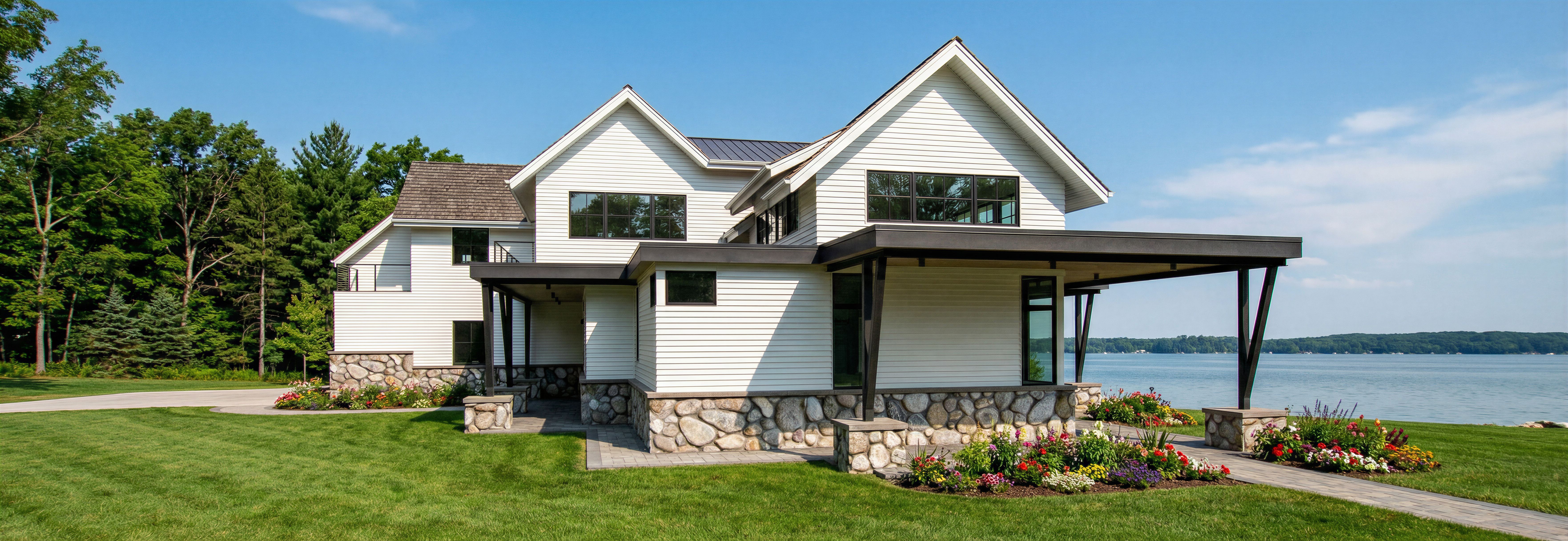 Make photorealistic rendering of the house, add lake view on the right in the background per Reference Image 1, add trees on the left behind the house, add flower bed between far side wall and walkway, lawn in the front, darker cedar shake roof, add flower bed on the left side of two posts , keep exact camera angle