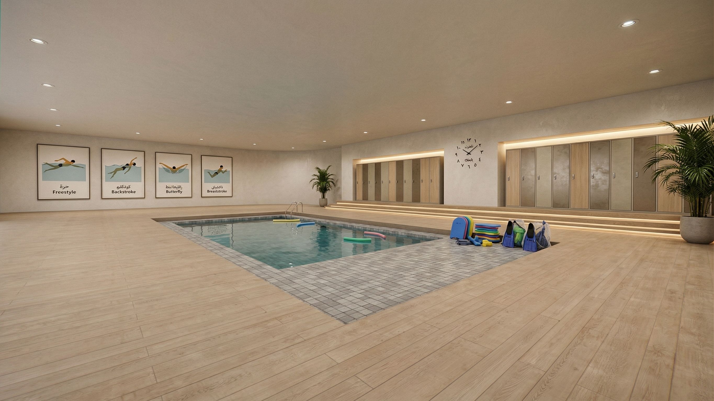 Promptthis is a scene of a educational swimming pool in syrian high school for student .. do simple interior and enhance the materials and make it super realistic and add swimming learning equiomwnts
