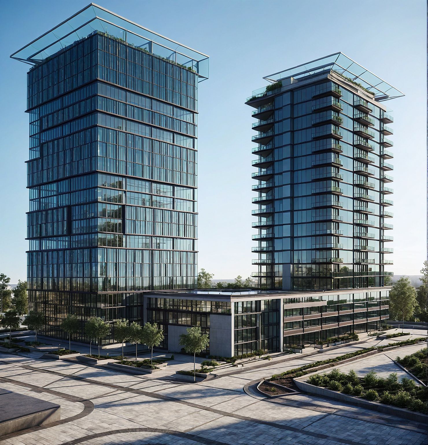 Promptmodern contemporary building, with glass and photorealistic texture, ambient warm sunshine with bold and clean lines, the building should be modern, add plants on the balconies and make the glass of the building , place short shrubs and trees only on corner edge of the balcony of the second building, make the glass of the building dark and add contrast on the building to make sure each floor can be seen clearly