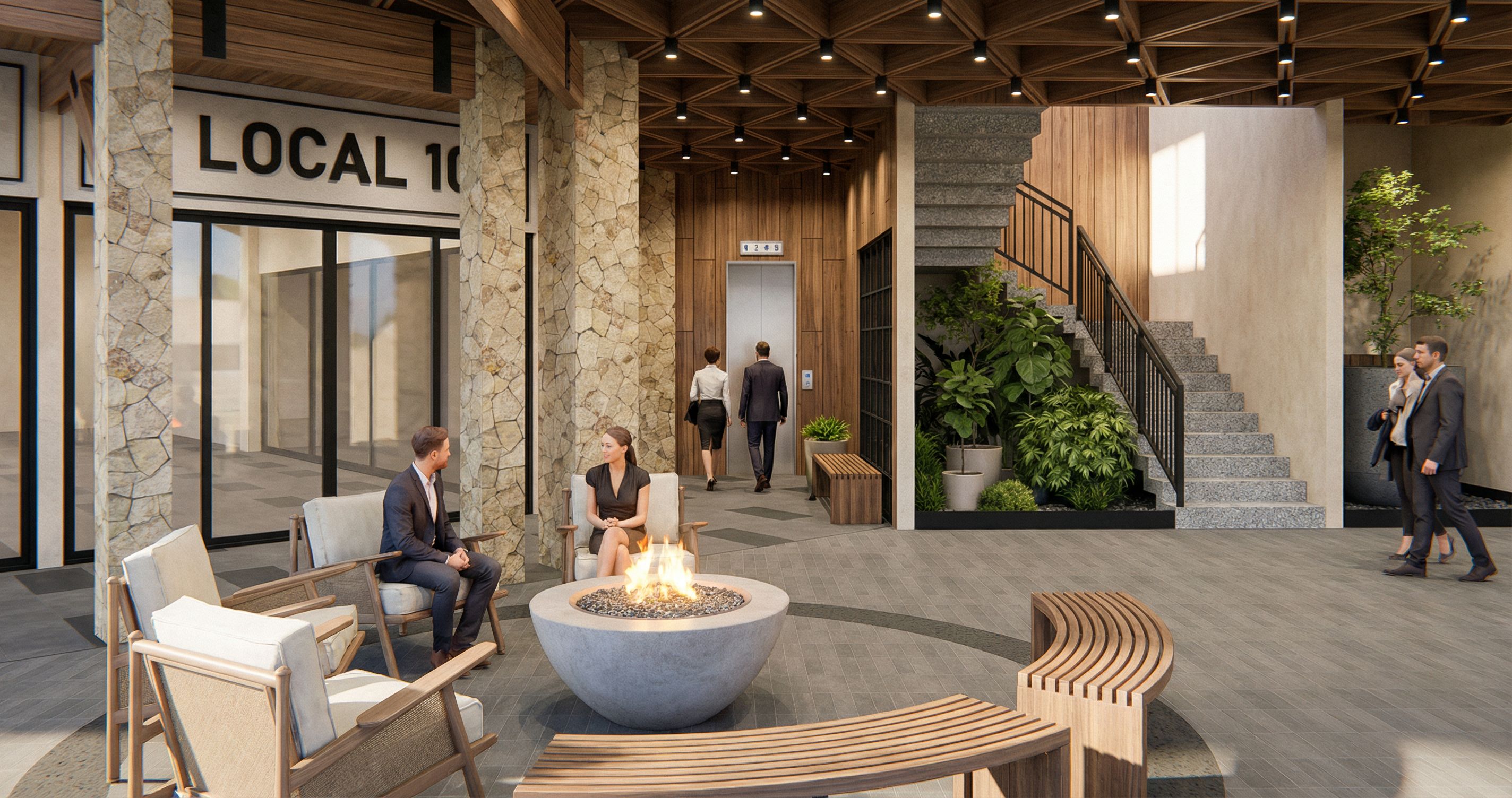 High-end photorealistic boutique hotel motor lobby, warm and sophisticated arrival experience. Gray 7x30 cm tile floor and granite-style stairs, natural matte walnut wood ceiling in grid layout with 10 cm black tubular lights at intersections, soft warm hospitality lighting. Local San Cristóbal flagstone columns, matte black metal railings and hardware. Aged concrete, modern plants, curated green area beside stairs. Low-profile aged concrete fire pit with subtle glow. Natural matte walnut wood wall paneling. Cinematic lighting, global illumination, realistic materials, soft shadows, ambient occlusion, wide-angle architectural lens, eye-level, ultra-high resolution.show the entire area of the uploaded image , keep exact camera angle
