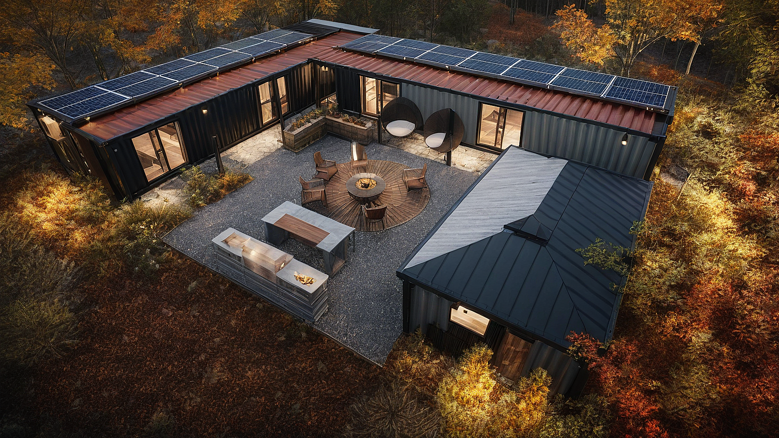 Promptcontainer house in the woods, modern, cozy, and warm in the autumn season