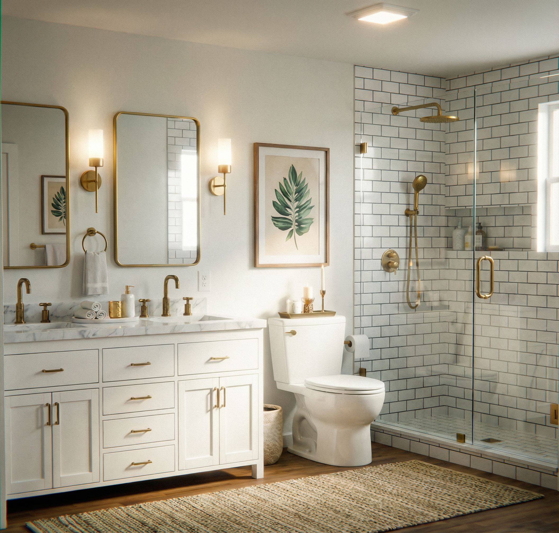 PromptChange the fixtures to brass, the shower to subway tile, one photo above the toilet, keep exact camera angle