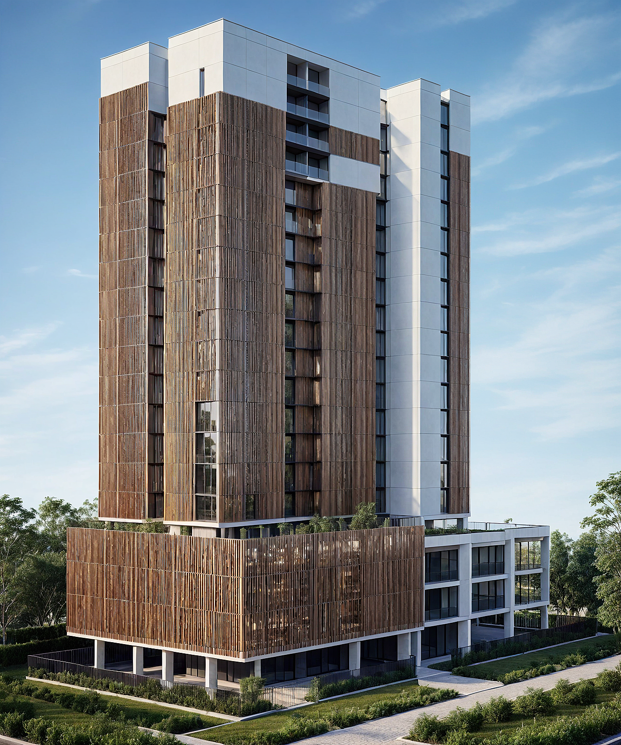 PromptA 3D architectural visualization of a modern residential building in cityscape with a distinct wooden slat facade wrapping around the lower floors with no glass. The building has a contemporary design, featuring textured paint structural elements on upper floors. The upper floors with no balconies or glass openings. The structure is elevated on columns, creating an open ground floor space. A surrounding metal fence encloses the perimeter. The background features a clear blue sky, landscaping