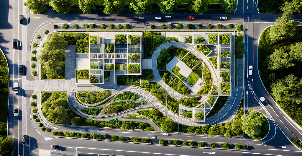 PromptOffice building, bank headquarters, sustainable architecture, environmentally friendly, simple shape, creating highlights, green architecture facade, green roof, light structure. Early morning rendering, warm stone