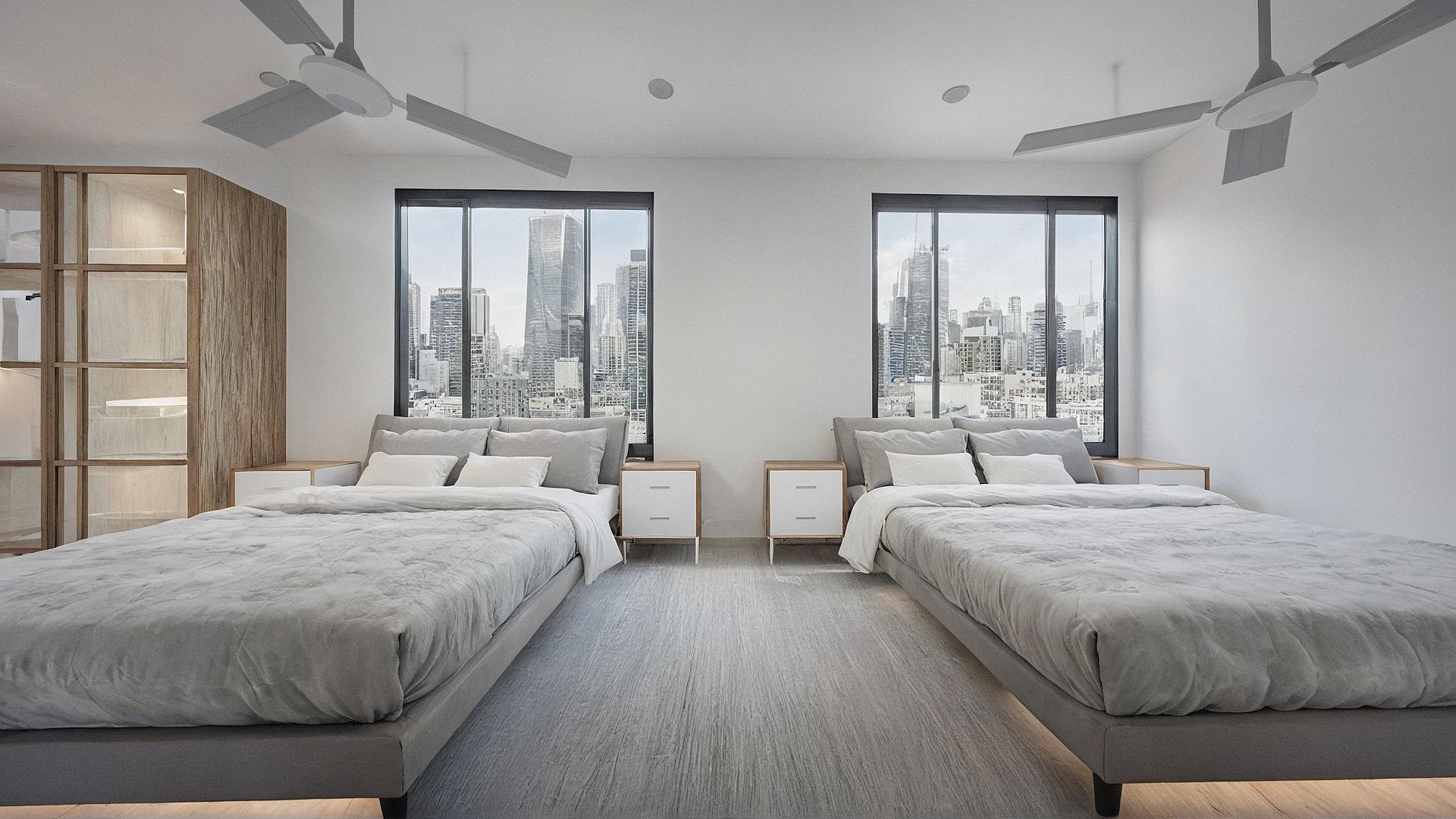 Photo of a modern apartment bedroom with two beds. Focus on sleek design elements like the wooden cabinetry and intricate textures of the bedding. The expansive windows provide a panoramic view of a bustling city skyline, integrating urban life into the setting. Bright, natural light filters through, creating soft shadows across the room. Captured from a low perspective to emphasize the height of the windows and depth of the space, using a wide-angle lens for a dynamic visual impact.