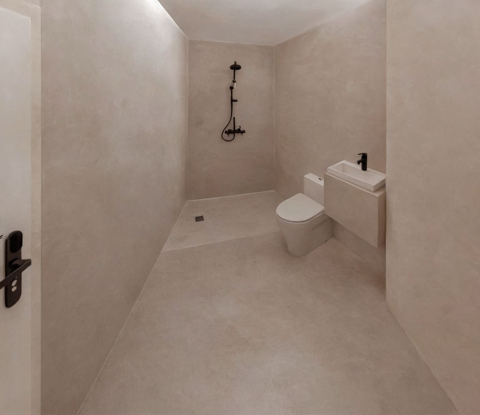 Bathroom with ceramic tiles in light tones such as beige or white on the walls and floor. sink and shower fixtures in black. modern style. in the shower with drying rack on the wall to use as a shelf