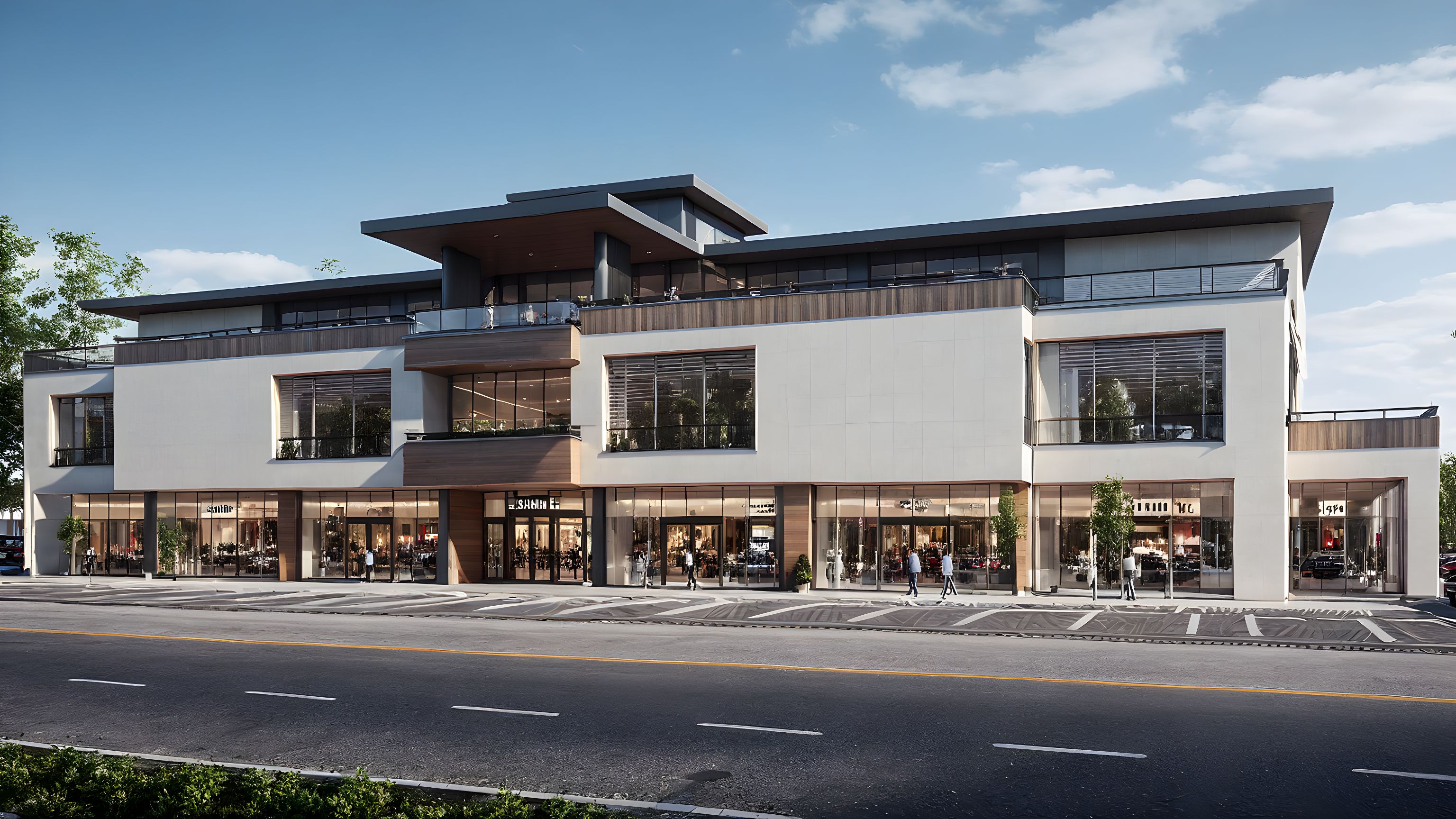 Promptshopping mall, cars, trees, people, realistic rendering, modern facade, realistic sky, parked cars, lighting on the facade, small trees in front of the building, people walking, cars passing by