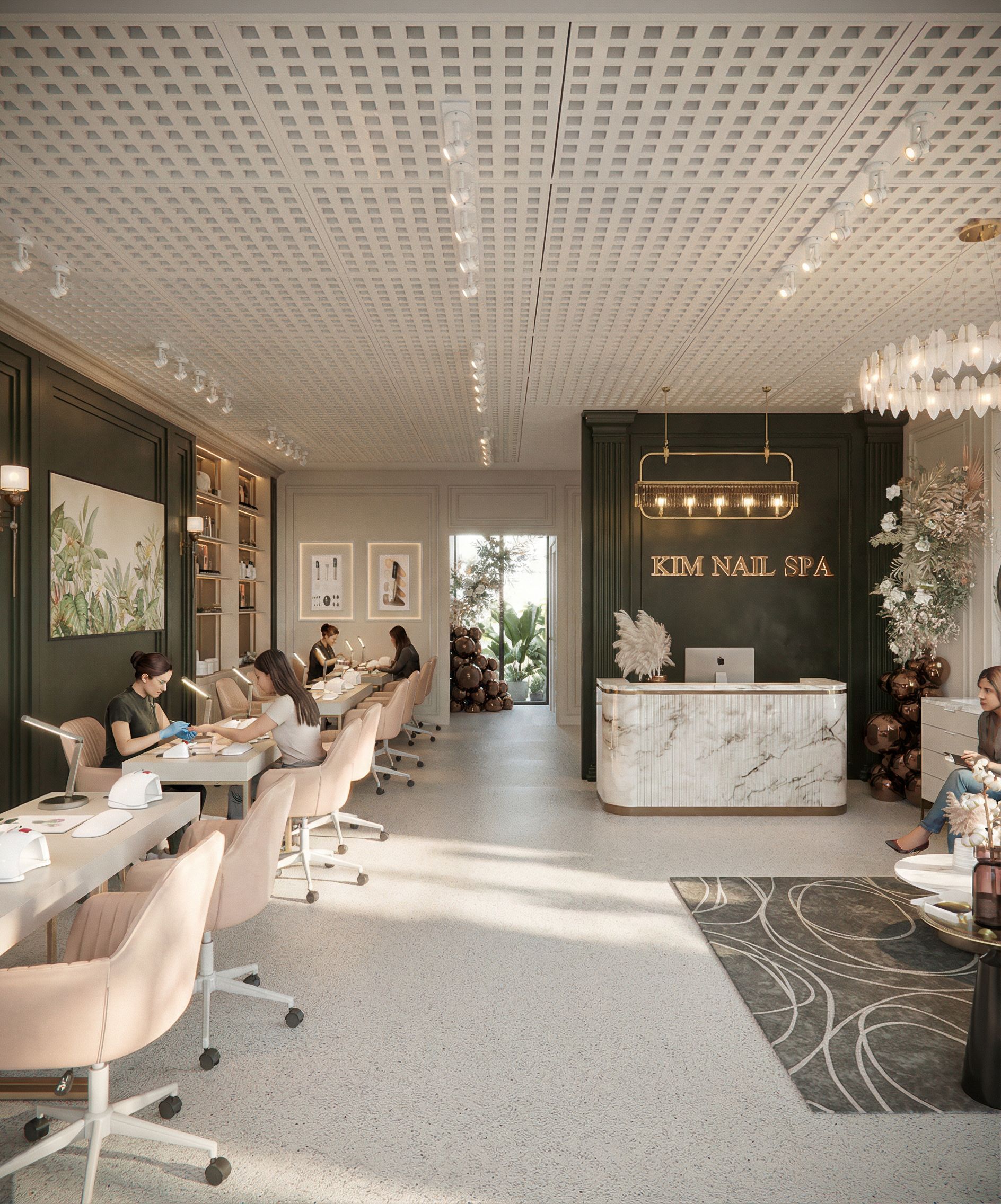 This photograph captures the interior of a modern salon, showcasing subtle architectural elements such as patterned ceilings and minimalist furnishings. The space utilizes soft, neutral tones, comfortable seating, and polished surfaces, complemented by lush greenery visible through large glass windows. Natural light floods the interior, creating gentle shadows and subtle accents. Shot from a wide angle, the composition emphasizes the open space and elegant design features, inviting viewers into a tranquil environment. The camera angle is maintained, preserving the architectural proportions and forms, as well as retaining the original materials, highlighting and depicting the textures as realistically as possible., keep exact camera angle