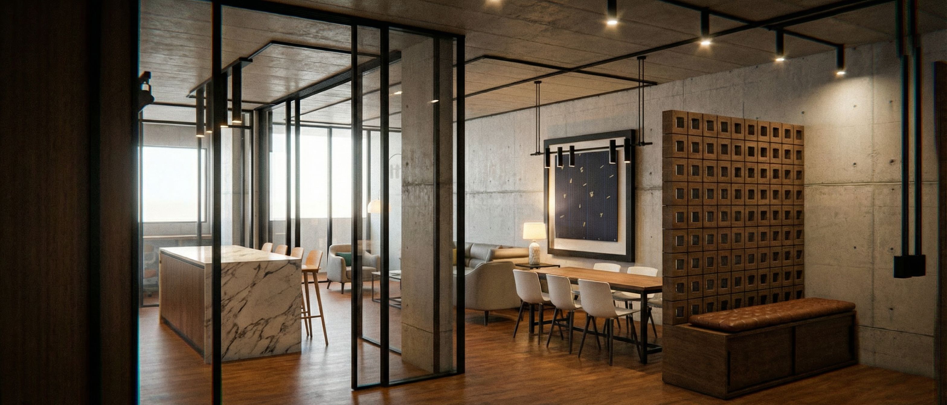 PromptAPARTAMENTO INDUSTRIAL ELEGANTE, SUELO MADERA MEDIO, MOBILIARIO ELEGANTE CARO, COCINA MADERA DE RIBLE , COLORES NATURALES, PIEDRA CALACATA, ARTISTICO, no cambies la perspectiva, no interpretes, no modifiques la volumietria, NO MODIFIQUES LA ESCENA