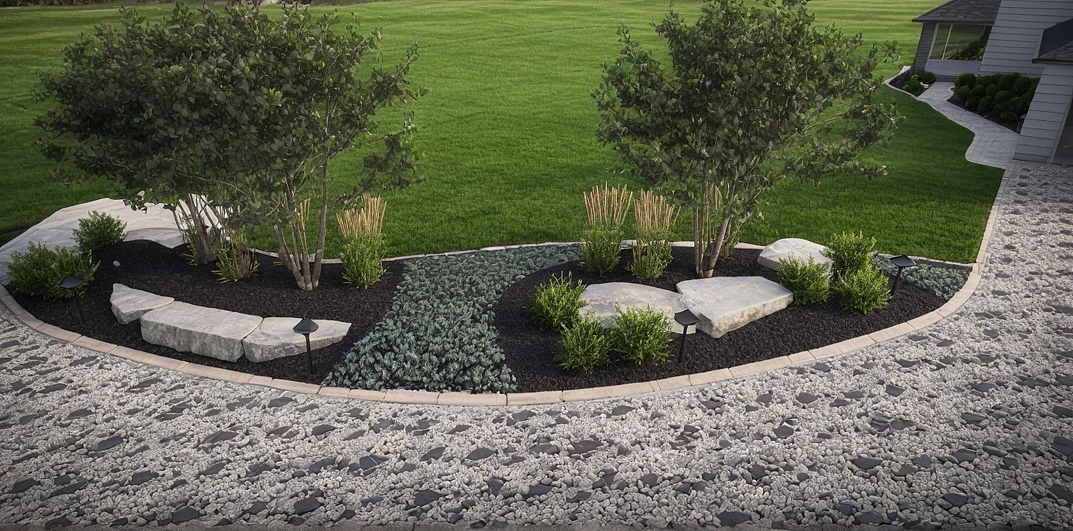 enhance, mulch, gray rock, concrete walkway, lawn, boxwoods