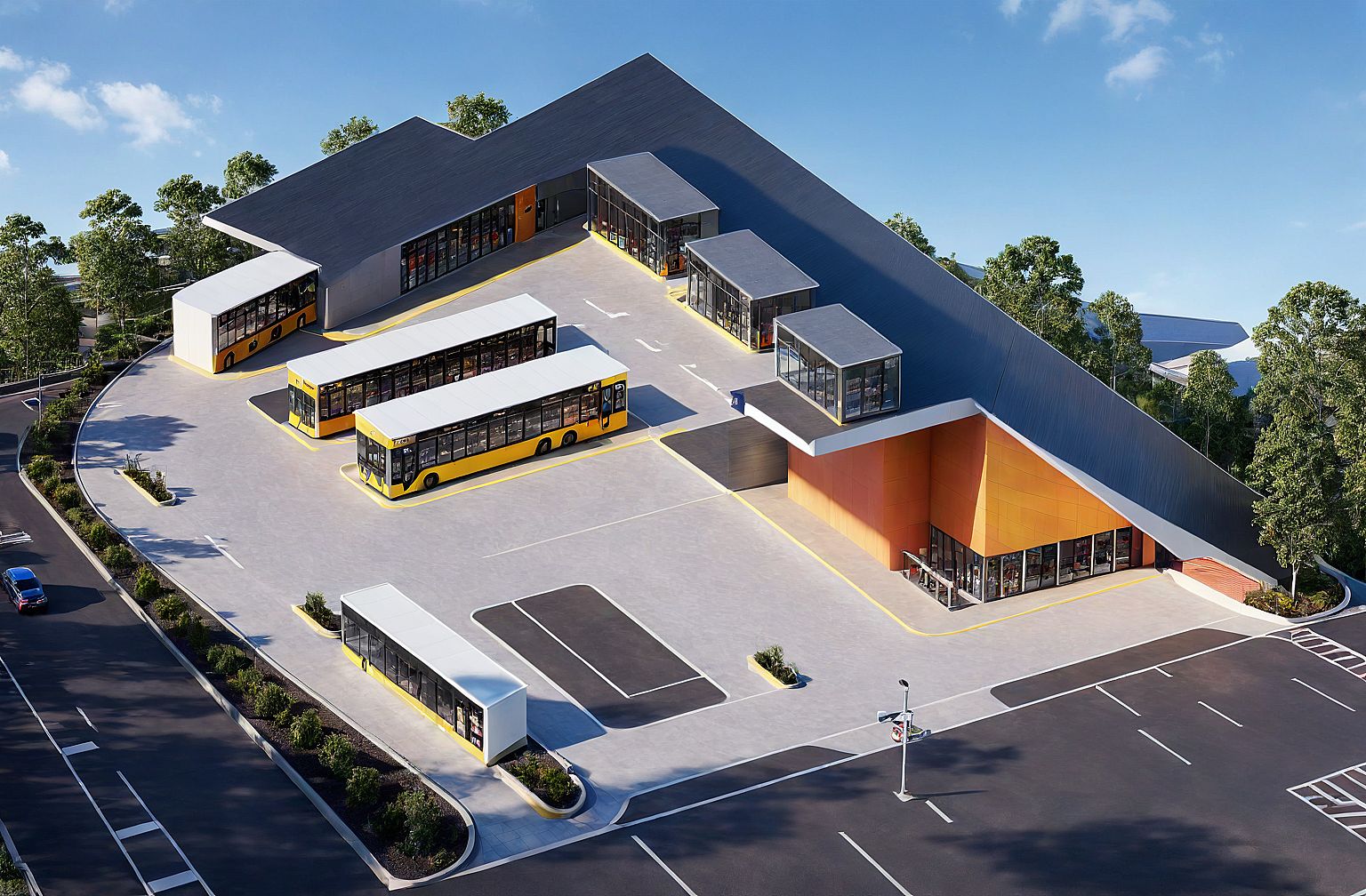 PromptPhoto of a modern gas station complex featuring an automated drive-through car wash and prefabricated convenience shops. Highlight the sleek, functional design with glossy materials and vibrant colors. Set in an urban landscape with visible bus lanes and seating areas, surrounded by lush greenery. The scene is bathed in warm, afternoon sunlight, creating dynamic shadows across the paving. Capture a low-angle view to emphasize the height of structures, using a wide-angle lens to include the broader context of the area.
