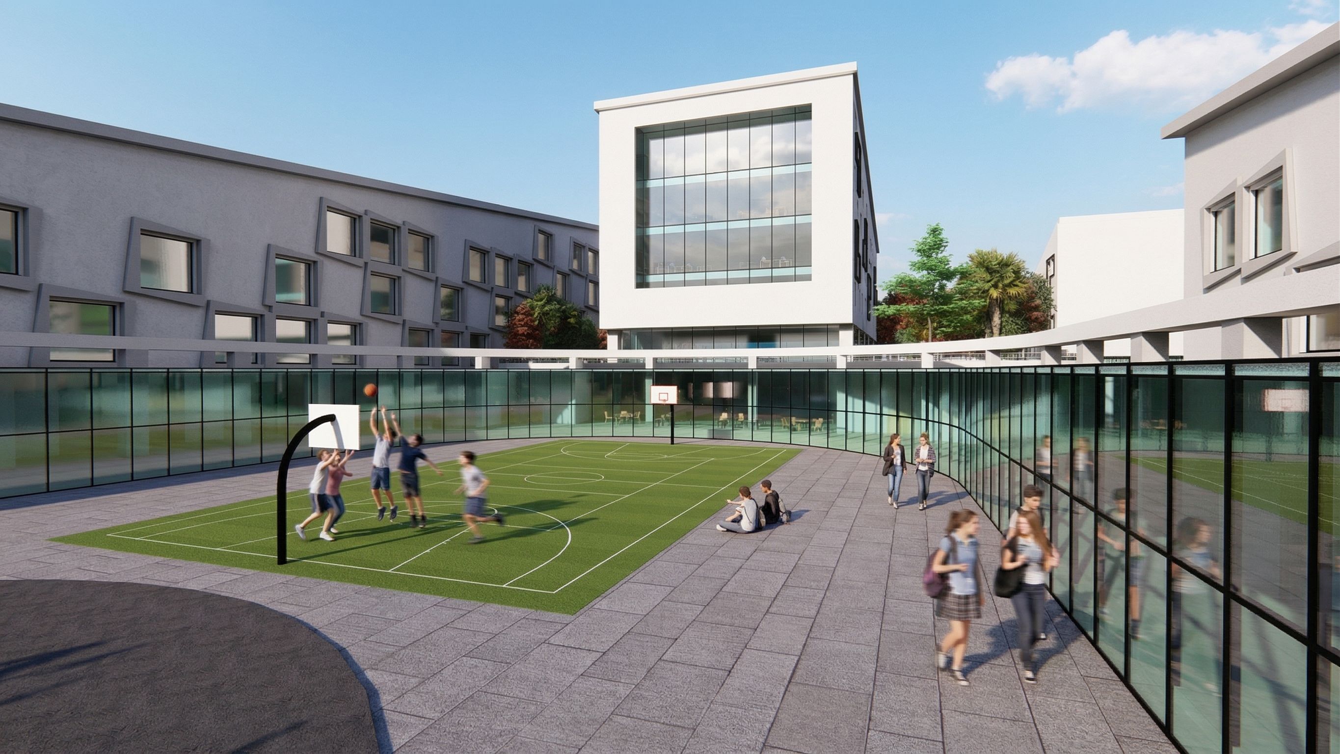 Photo of a modern educational facility featuring a unique blend of angular and glass design elements. Emphasize the sleek glass façade, intricate window arrangements, and open courtyard with a sport court. The urban environment showcases landscaped greenery, enhancing the structure's integration with nature. Capture bright, natural daylight highlighting textures and reflections on the glass surfaces. Utilize a wide-angle lens for a dynamic perspective, framing the building alongside the play area, creating a sense of space and interaction. ADD SECONADRY AND HIGHSCHOOL STUDENTS AND MAKE THE SCENE SUPER REALISTIC , keep exact camera angle