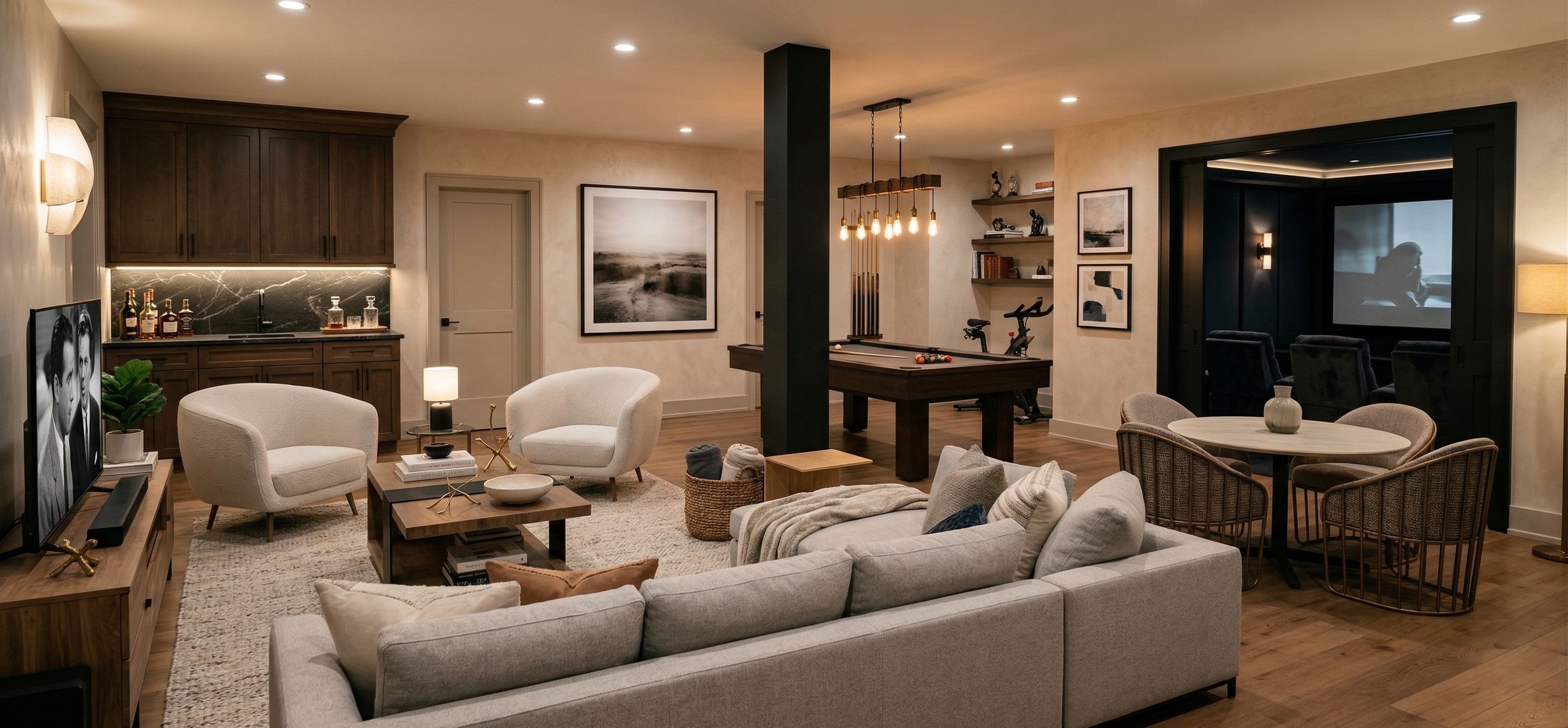 Promptcozy basement, add black pocket style doors no glass at black theatre room, opened, keep exact camera angle