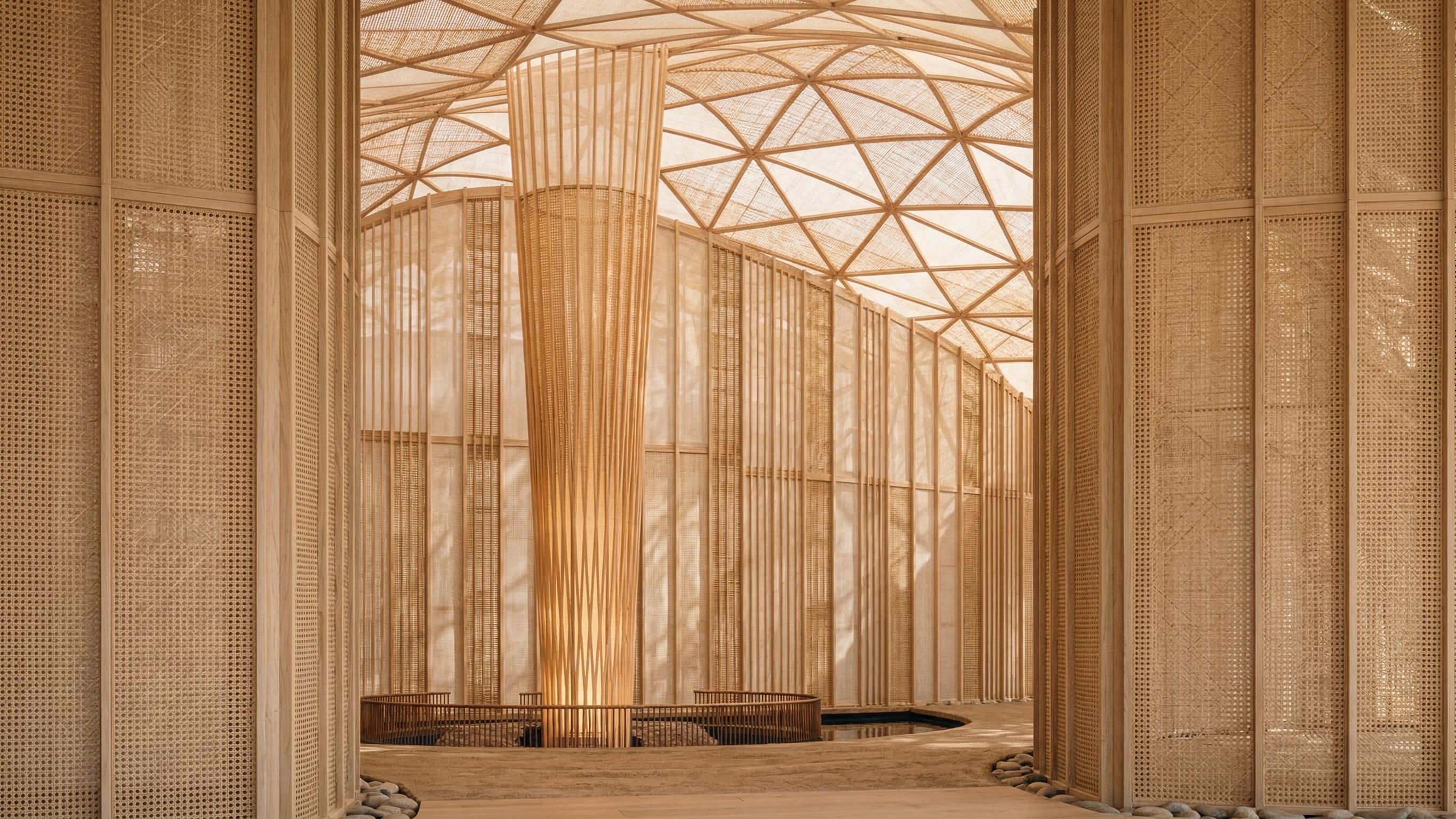 Transform this existing architectural interior render without changing the geometry, camera angle, proportions, layout, or structural form. Keep the domed roof, circular opening, central vertical element, and overall spatial composition exactly the same. Change the materials and atmosphere to match a soft, warm, woven, filtered-light pavilion aesthetic. Replace the current smooth and digital-looking surfaces with a palette of pale natural wood, thin vertical timber framing, woven reed or bamboo screening, light cane-like panels, and delicate translucent fabric layers. The walls should feel light, tactile, and handmade, with subtle variation and natural fiber texture rather than solid opaque surfaces. Introduce suspended or stretched fabric-like layers that soften the enclosure and create a sense of transition and filtering between spaces. The material language should feel calm, airy, sacred, and lightweight. Let the roof structure feel filtered through woven or screened material so light enters as a soft glow rather than harsh direct light. Use warm beige, sand, oat, honey wood, linen, and light straw tones. Avoid bold colors, glossy finishes, dark metals, or futuristic surfaces. The central vertical element should feel like a delicate timber or woven screen structure, elegant and light, almost lantern-like. Create soft shadow play across the floor and walls from the screened materials. The atmosphere should feel serene, spiritual, and immersive, with diffused daylight, gentle contrast, and a peaceful handcrafted quality. The final render should look architectural, refined, atmospheric, and realistic, with natural materials and a quiet poetic mood. Important constraints: do not alter the form do not redesign the roof geometry do not move walls or openings do not add furniture unless minimal and necessary do not make it look futuristic or overly decorative keep the space minimal, calm, and material-focused Here’s a shorter version in case the website works better with compact prompts: Short prompt: Keep the exact geometry and camera view. Re-materialize this interior to match a warm woven pavilion aesthetic using pale timber, bamboo or reed screens, cane panels, translucent fabric layers, and soft natural textures. Create a serene sacred atmosphere with filtered daylight, soft shadows, warm beige and honey tones, and a lightweight handcrafted feeling. Preserve the domed roof, circular opening, and central vertical structure exactly as shown. No glossy finishes, no bold colors, no futuristic look. And here’s a negative prompt you can add if the site allows one: Negative prompt: do not change geometry, do not change camera angle, no concrete, no glass curtain wall, no steel industrial finish, no dark materials, no neon colors, no futuristic style, no heavy furniture, no clutter, no ornate decoration, no harsh lighting, no cartoon effect, keep exact camera angle