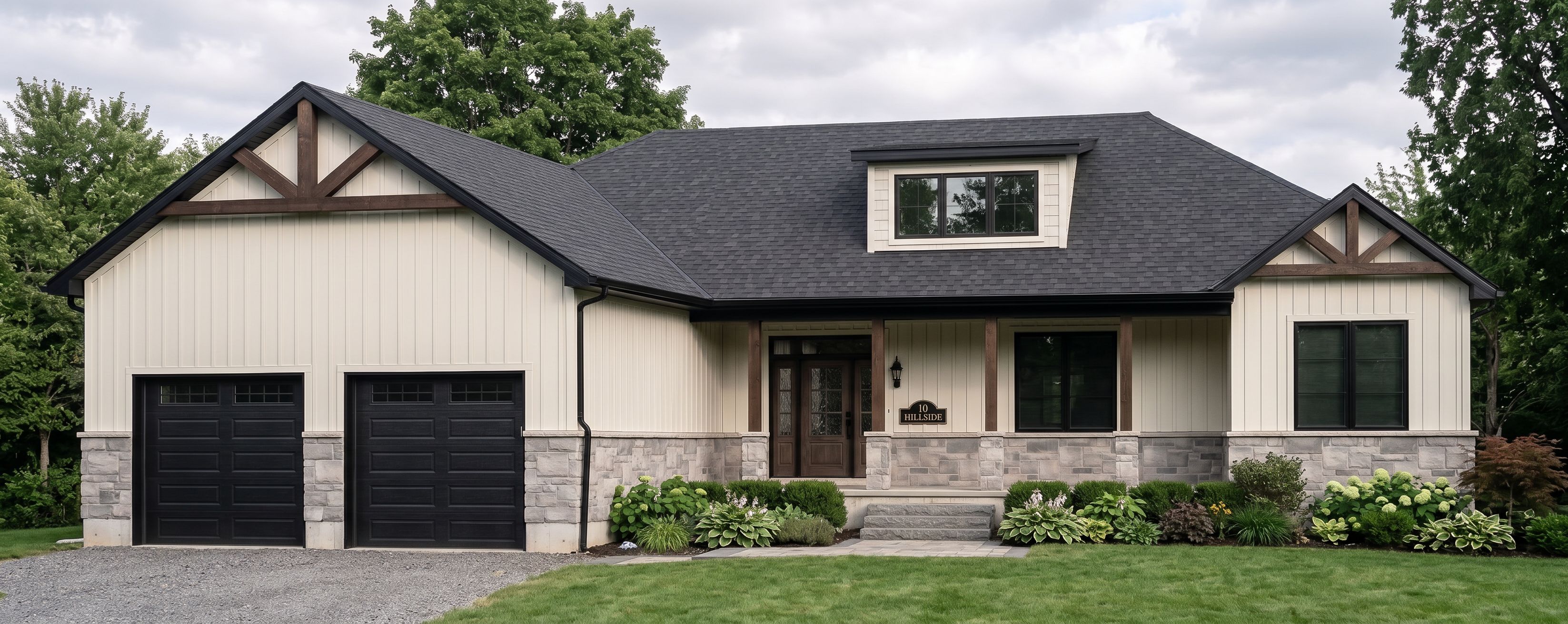 One photo of a modern residential house featuring a combination of textured stone and VERTICAL siding. The design emphasizes contrasting materials with dark trim accents and large windows. Set in a tranquil suburban environment, surrounded by lush greenery. Soft, natural daylight illuminates the facade, casting gentle shadows across the entrance. The perspective is angled to showcase the depth of the porch and the garage doors, with a 35mm lens highlighting details and textures., keep exact camera angle
