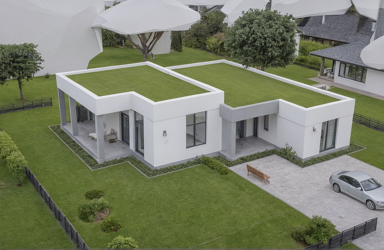 PromptContemporary single-story house with a flat roof and minimalist forms. Behind the house, there is a dense, well-maintained green hedge, lush lawn, and minimalist landscaping set against a landscaped suburban backdrop. Warm daylight with soft shadows highlights the architecture. Shot from a low angle, focusing on the greenery and the facade. well-maintained green hedge and lush grass directly behind the house, with minimalist shrubs and soft landscaping, evoking a manicured suburban garden.