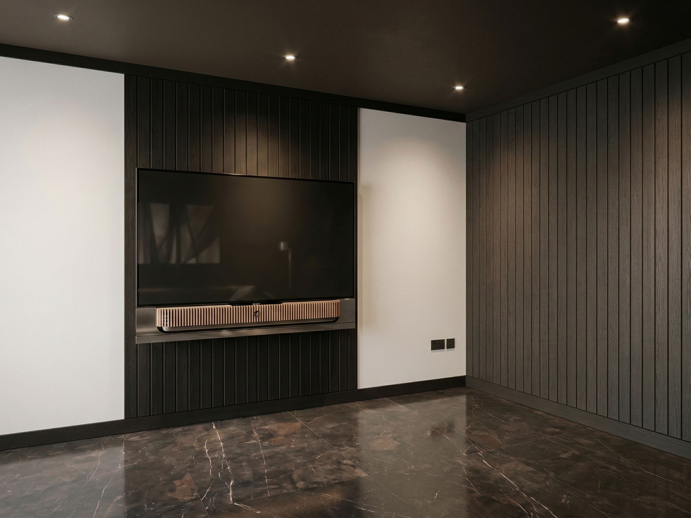 PromptOnly the black cover has to be covered with wood. The rest of the wall has to be plain white. Can you remove the wooden padding from the left and right side of the back wall? The wall on the right side stays the same. , keep exact camera angle