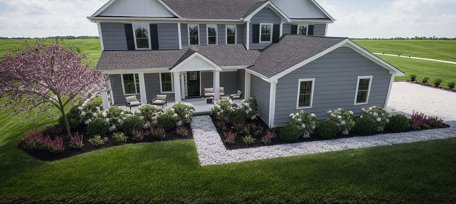 light gray house, white trim, lawn, black mulch, redbud tree, boxwoods