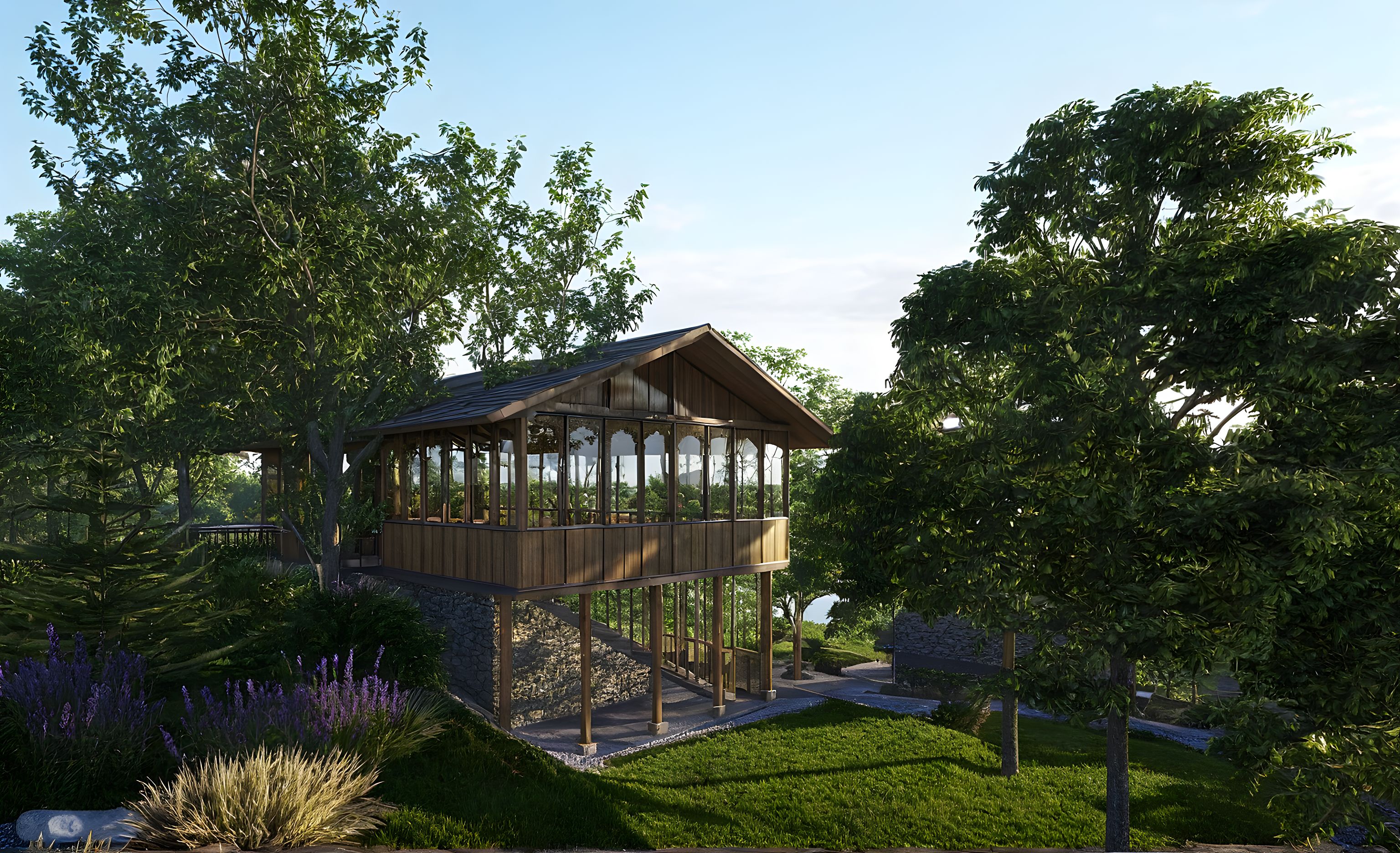 PromptCreate a hyper-realistic morning render of a raised, glass-enclosed pavilion set within a carefully landscaped hillside. The structure, featuring warm wooden framing, arched window panels, and a textured stone base, should remain exactly as shown. Preserve the surrounding planting design: manicured grass, pockets of ornamental grasses and lavender, and tall forest trees with light dappling through the canopy. Emphasize a clear, inviting morning atmosphere with golden sunlight grazing across the pavilion’s wooden surfaces and the upper foliage, creating soft shadows and a warm glow inside the glassed lounge. Show gravel detailing along the pavilion base and steps, and maintain the sense of peaceful elevation, with subtle glimpses of the landscape beyond. The composition should balance human-made elegance and natural calm, avoiding visual clutter or wild overgrowth. Keep all material textures, vegetation choices, and color tones as in the original image—no stylization. enhance the vegetation into a very realistic and organic.