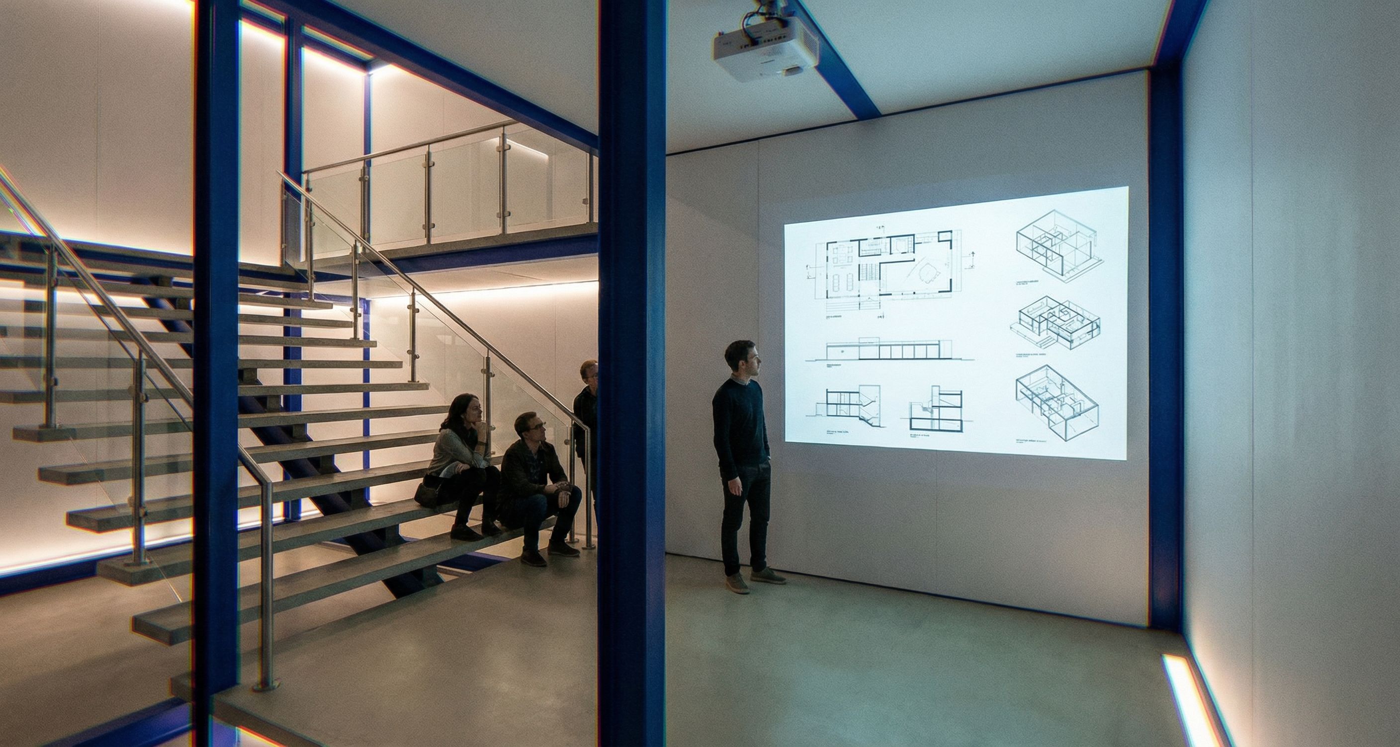 IMAGE-TO-IMAGE. Use the reference image as the base and KEEP THE GEOMETRY 100% UNCHANGED blue steel frame, walls, openings, camera view, platform position. Do not move or reshape any architectural elements. Only remove wrong furniture/lighting and add required safety elements + projection setup. STRICT REMOVALS MANDATORY: - Remove ALL tables and ALL chairs/stools completely. - Remove ALL decorative pendant/track spotlights that illuminate the projection wall or create glare. There must be NO lighting that disturbs the projector image. SPACE FUNCTION: This is a projection/critique zone for architecture presentations. The main focus is the projected content on the wall, not seating or working at tables. PROJECTOR MANDATORY: - Keep/add a projector aimed at the wall. - The projection must be clearly visible and high-contrast. - Content: architecture-related plans, sections, axonometric diagrams. NO readable text, NO logos. LIGHTING MANDATORY — projector-friendly: - Overall lighting should be dim / low ambient, “presentation mode”. - Use only minimal indirect light for safe movement very subtle wall-wash or floor-level guidance, but do not wash out the projection. - No ceiling spotlights hitting the projection wall. STAIR FIXING + SAFETY VERY IMPORTANT: - The stair must look structurally connected and stable no floating steps. Connect the steps with a realistic support system: - either a central stringer Mittelholm or concealed side stringers, - with proper brackets/attachments to the blue steel structure. - Add proper handrails and guardrails: - Handrail along the stair. - Glass or metal guardrail along the open edges near the stair and around the platform perimeter fall protection. - Use clear safety glass with slim metal posts/clamps + a simple top rail. Everything must look realistically attached no floating glass. MATERIALS / COLORS: - Everything blue stays bright saturated blue and reads as painted steel profiles no hue shift. - Walls: clean white/very light panels MDF/HPL, not concrete. - Floor: light exposed concrete / light neutral floor, clean and matte not shiny. BACKGROUND: Keep the environment neutral and minimal, no extra furniture clutter. QUALITY CONTROL: No warped geometry, no melted edges, no distorted perspective, no stretched textures. Keep it clean and believable. Output: a clean projector presentation zone with a visible projection, no tables/chairs, dim projector-friendly lighting, and safe code-like railings + properly supported stairs, while keeping the original forms unchanged. , keep exact camera angle