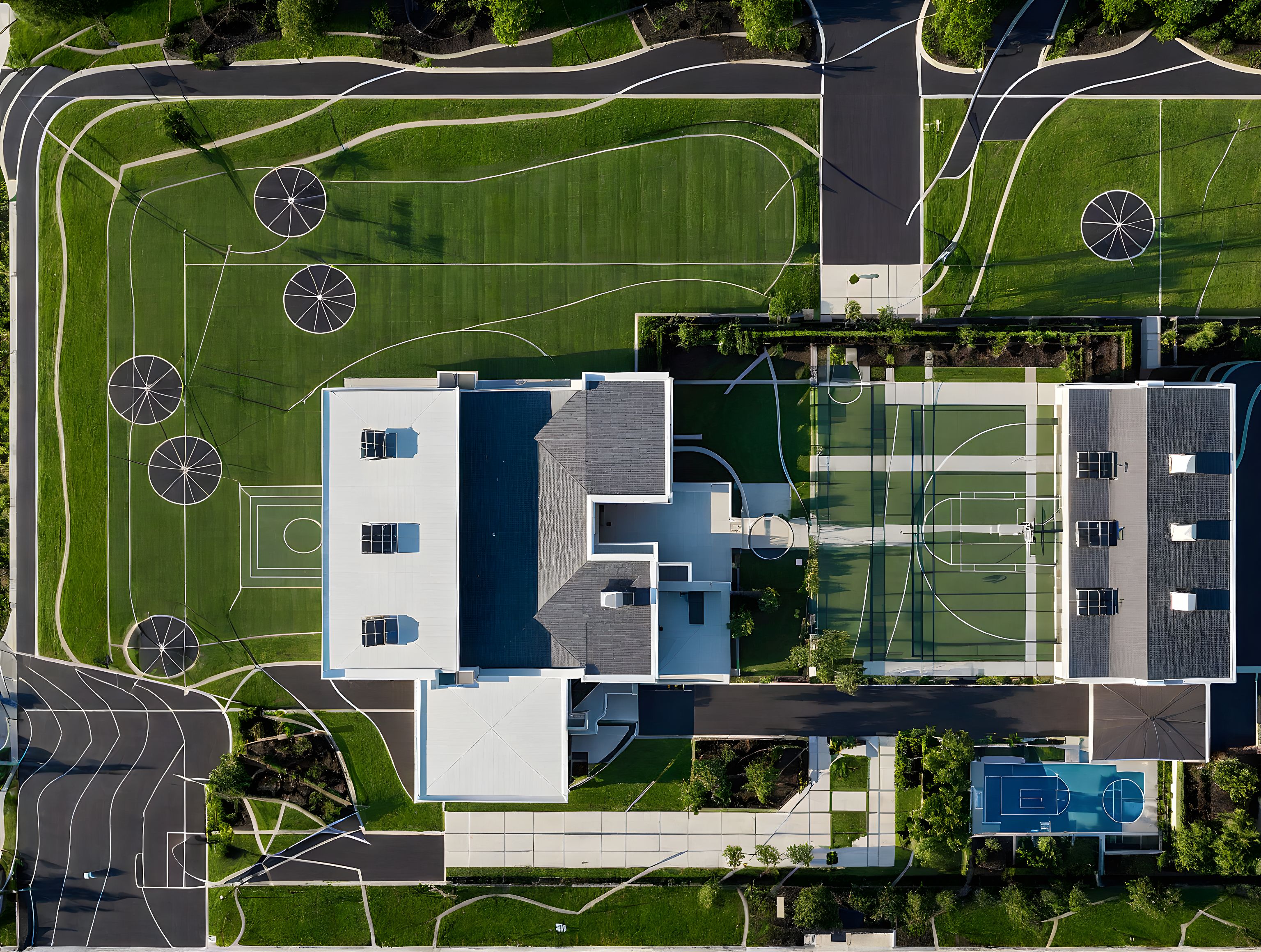 Birds Eye view Photo of a contemporary residential building , Surrounded by lush, manicured lawns and strategically placed trees, creating a harmonious relationship with nature. Early morning light casts soft shadows, enhancing the building’s textures, while an aerial view captures the layout, including a basketball court. A wide-angle lens perspective reveals the entire facade and surrounding landscape, emphasizing space and openness.