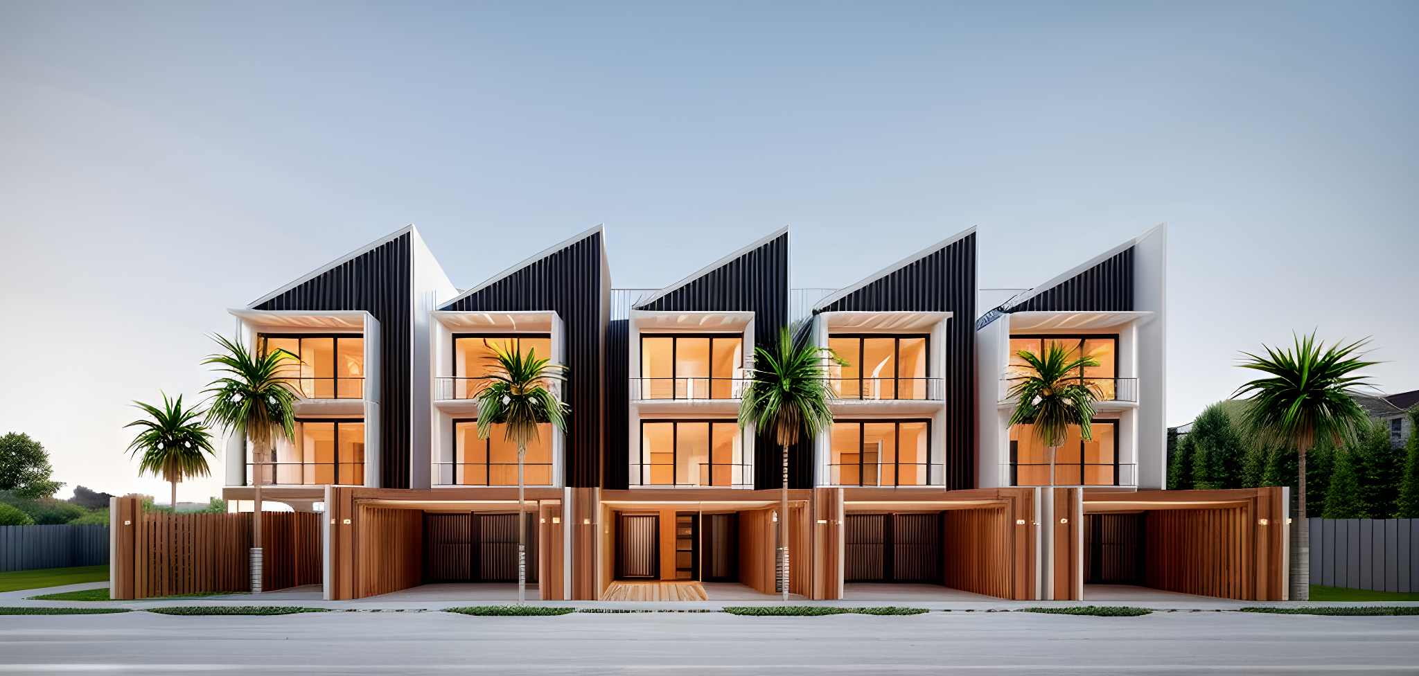 Promptphoto realistic image of row townhouses, external white walls, with wooden slats interior facade, glass with soft interior lighting, wooden entry gate, with lush greenery within neighbourhood context