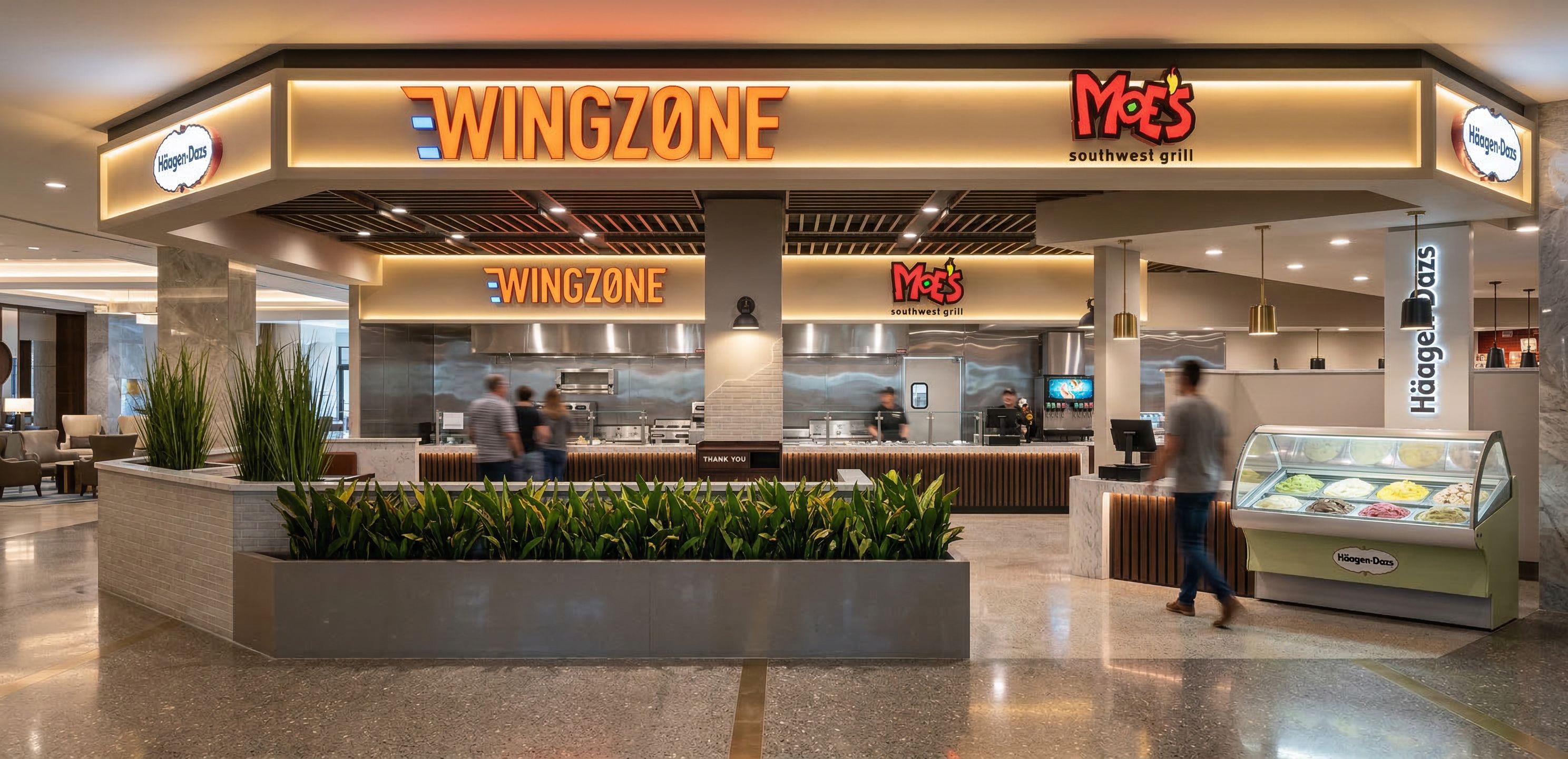Food Court in Hotel. Show indirect soffit lighitng. Internally illuminated signage. Bright and vibrant. Downlighting. , keep exact camera angle