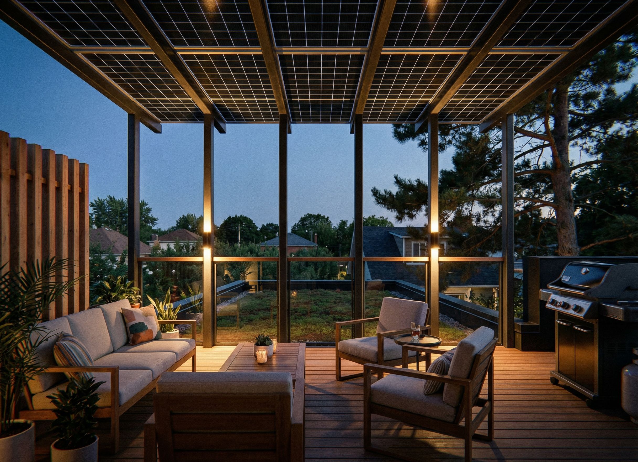PromptOutdoor wood roof deck, skinny 3 x 3 metal trellis with solar panel roof immediately above, wood privacy screen left side, outdoor patio furniture overlook green roof immediately beyond at same level as deck, over orchard straight ahead and through one tall Scot's pine with branches overlapping green roof to the right, BBQ on right , views to suburban rooftops and trees beyond Follow geometry , keep exact camera angle