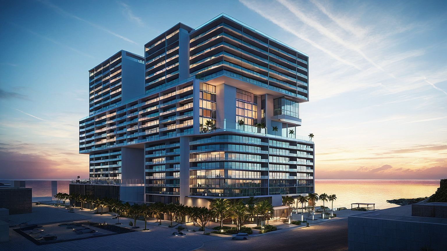 Promptmodern apartment building by the sea. it has a dock with boats, palms trees, and glass windows from floor to ceiling. add lights and furniture inside the apartments. add warm lights. add colorful murals to the walls. change the time to morning. add sea birds flying
