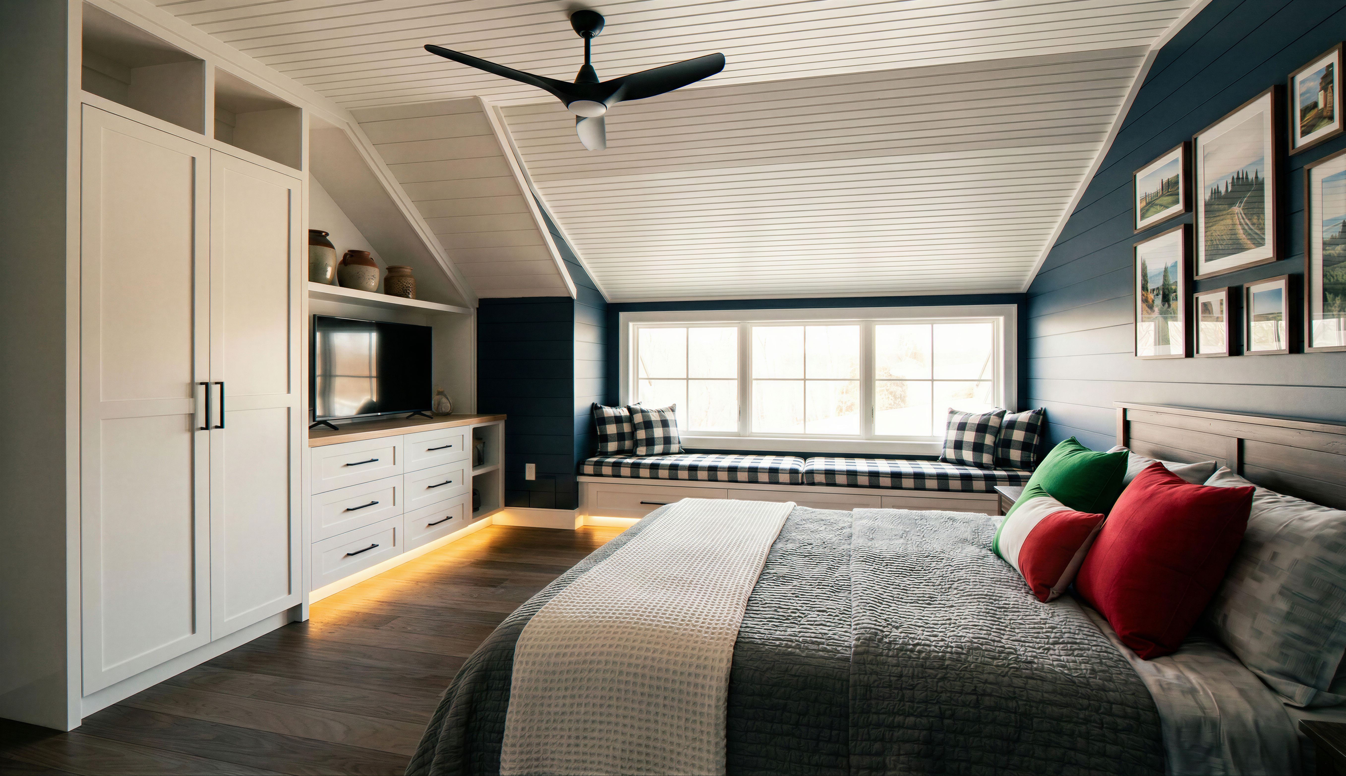 EnhancedPromptmake photorealistic rendering of the bedroom, add built-in on the left wall between the door and window per Reference Image 1, built-in cubies above tall cabinet and up to the ceiling, bench style per Reference image 2, bed per Reference Image 3, pillows in Italian colors, materials and colors on the wall and ceiling per Reference Image 2, keep exact camera angle