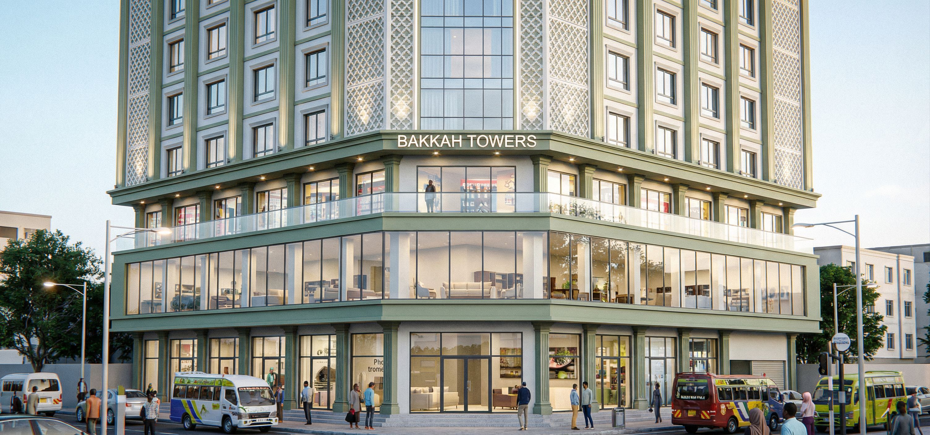 MAKE GLASS CLEAR, REFLECTIVE AND REALISTIC. USE THE COMBINATION OF COLOURS IN THE REFERENCE IMAGE. WRITE NAME"BAKKAH TOWERS" AT THE TOP CORNER JUST ABOVE THE ARCH. MAINTAIN NUMBER OF LEVELS OF BUILDING AND CAMERA ANGLE. INTRODUCE CURTAIN WALLING BEHIND THE LATTICE WORK. RENDER OF A BUILDING IN EASTLEIGH AREA IN NAIROBI DURING THE DAY. TWENTY STORIED BUILDING WITH GROUND FLOOR AS COMMERCIAL, FIRST FLOOR FURNITURE SHOP WITH CLEAR GLASS AND SECOND FLOOR SHOPS WITH GLASS BALCONY. THE REST OF THE FLOORS APARTMENTS. SHOW THE WHOLE BUILDING TO THE TOP AND INTRODUCE CURTAIN WALLING BEHIND THE MASHRYABIYA. USE COMBINATION OF A LIGHT PASTEL GREY AND WHITE ON THE BUILDING. INTRODUCE ROPE LIGHTS , STREET LIGHTS AND SPOT LIGHTS IN THE BUILDING. MAINATIN DESIGN OF ORIGINAL IMAGE, CHANGE COLOUR ONLY. USE SHADES OF BEIGE ON THE BUILDING. AMINTAIN CAMERA ANGLE. CHANGE COLOUR TO THE COMBINATION OF TWO COLOURS IN THE REFERENCE IMAGE. SHOW IMAGE ALL THE WAY TO THE TOP., keep exact camera angle