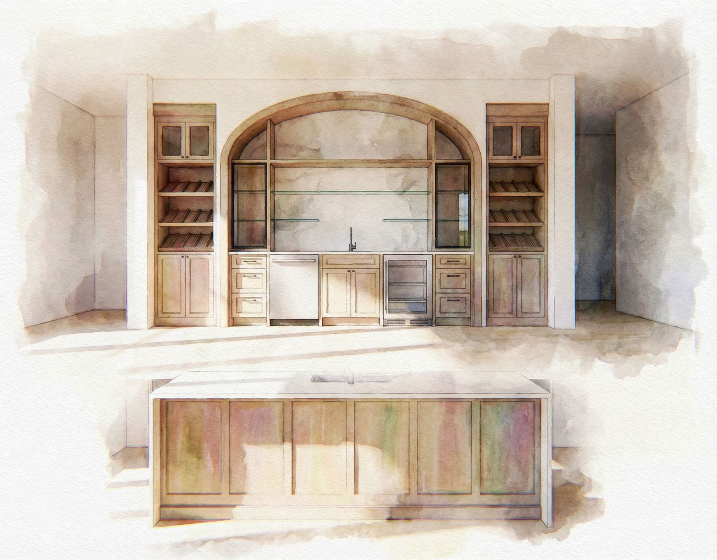 create a 3d rendering of the millwork using the attached plan and elevation. don't add anything to the millwork that isn't shown on the elevation , keep exact camera angle