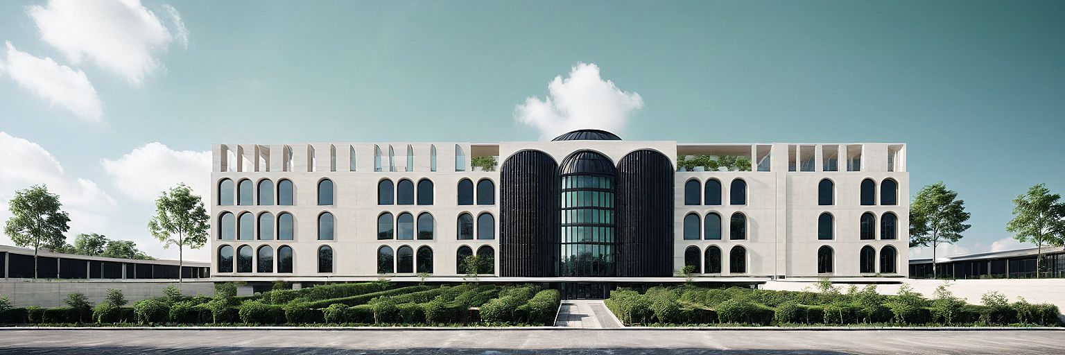 PromptHospital building made with pure white travertine having curtain wall on facade some part of curtain wall covered with black steel louvres and atrium dome on roof for natural light. Green terraces
