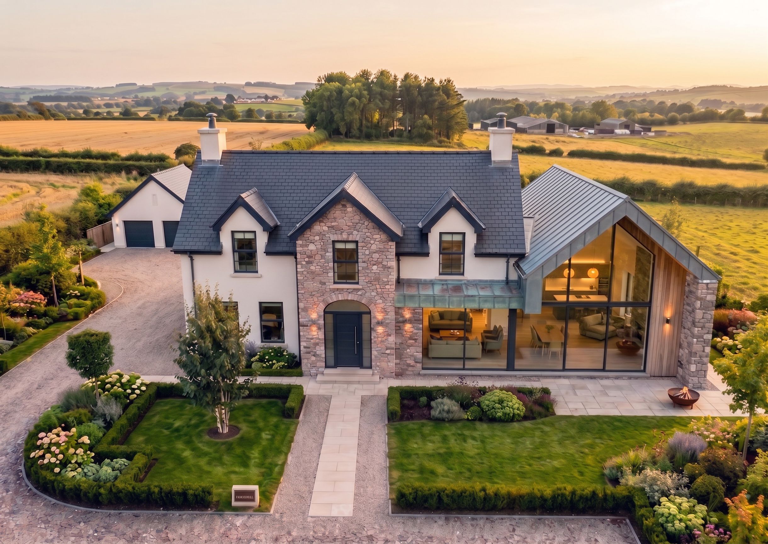can you give me another concept of a modern extension on to the right side of the primary structure of the house similar to the reference images. Use different materials but keep the main structure of the house the same with the stone work in the middle.