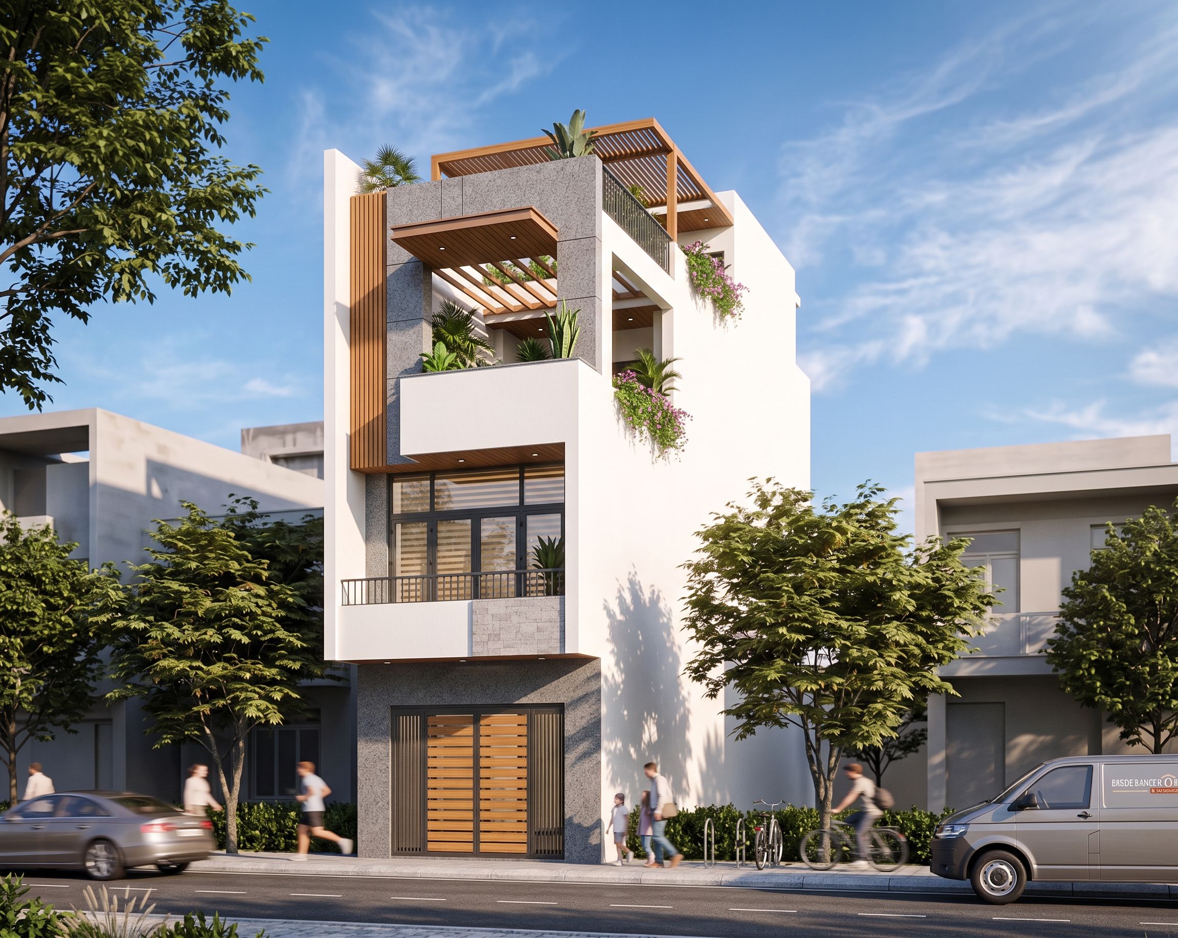 This photograph captures a modern multi-story apartment building, harmoniously blending sleek white walls with a subtle light grey natural stone finish. Black-painted iron balcony railings, behind which potted plants accentuate the contemporary architectural details. Situated in an urban environment surrounded by low-rise buildings and lush greenery, it creates a vibrant streetscape. The image was taken in the bright afternoon sun, creating striking shadows and highlights on the facade. A low angle is used to emphasize the height and design elements, mimicking a wide-angle lens to create an impressive and dynamic scene., keep exact camera angle